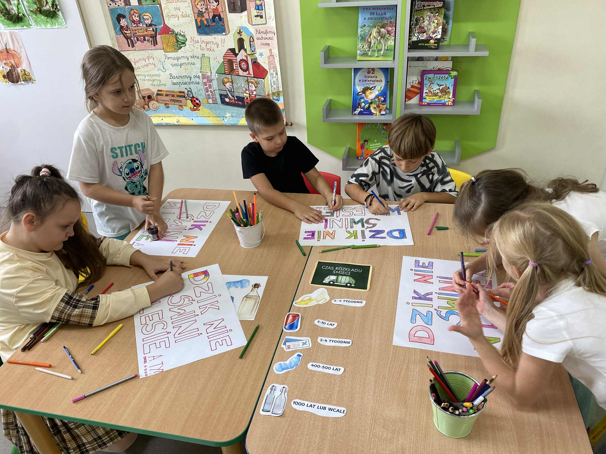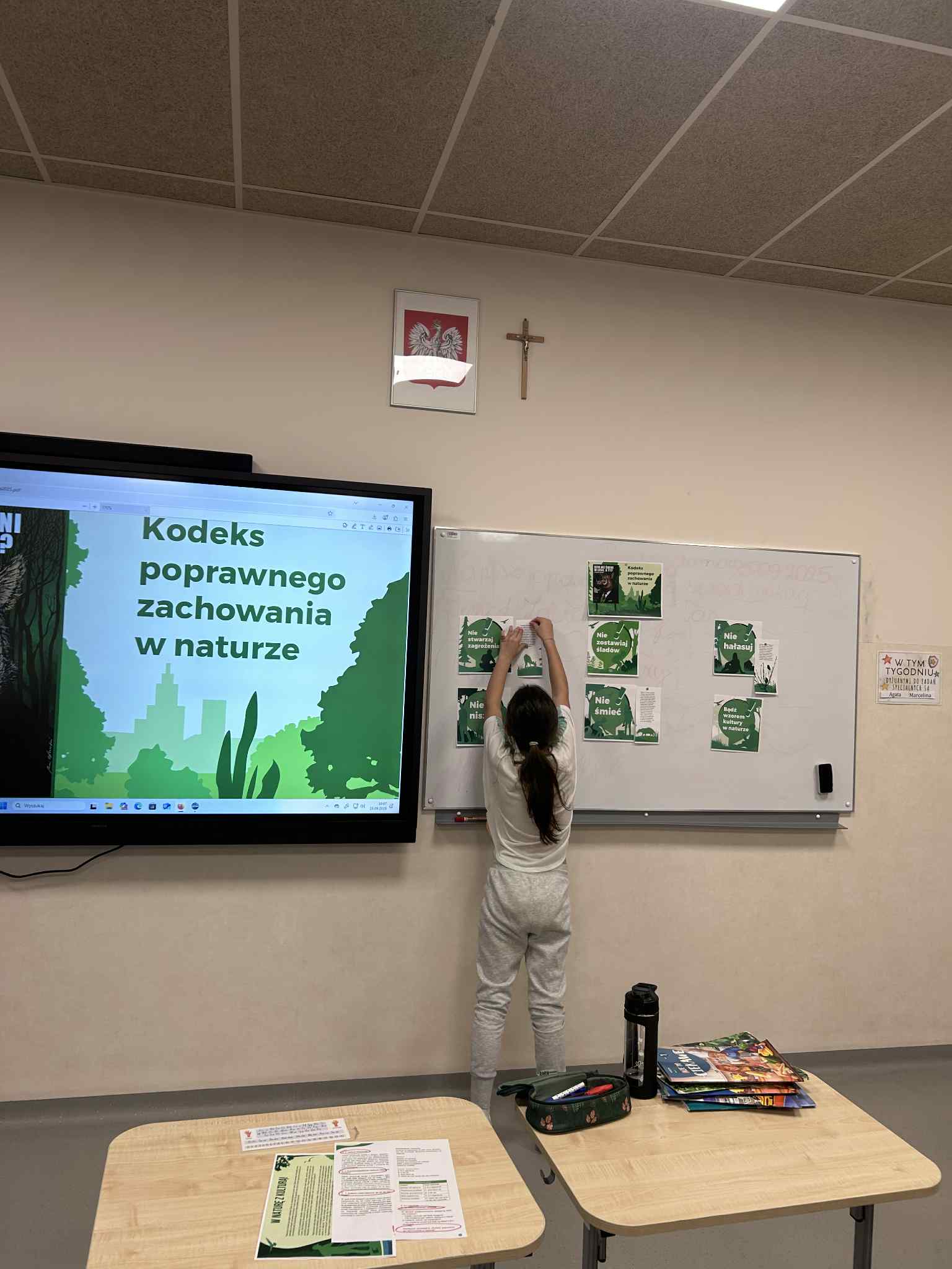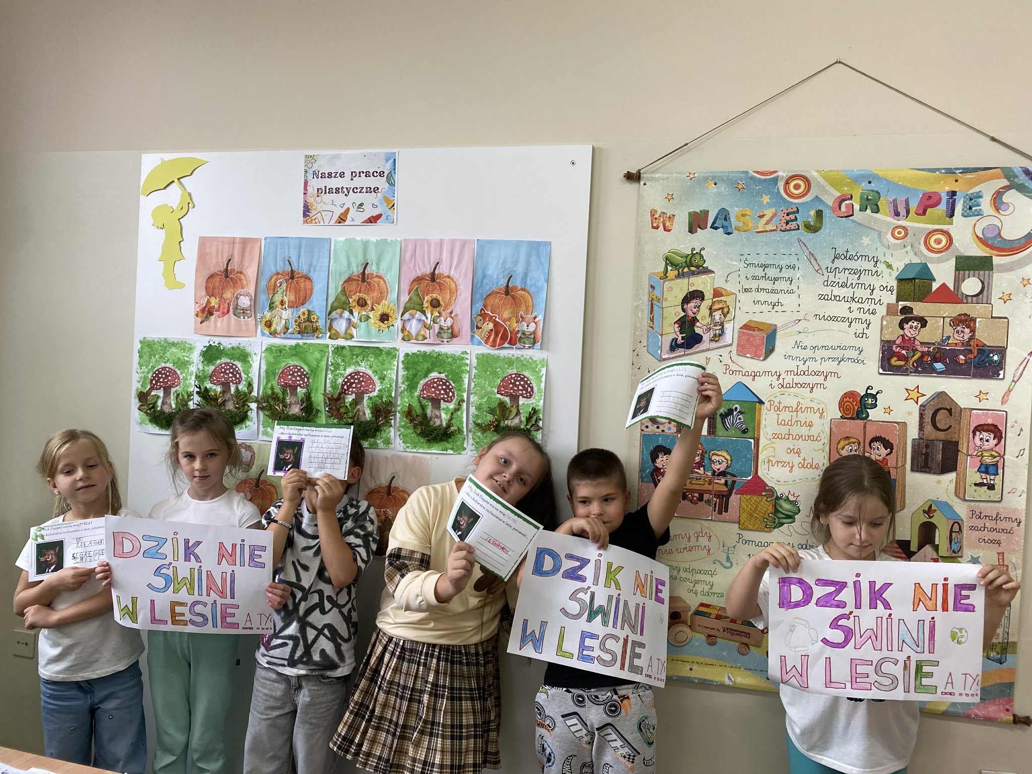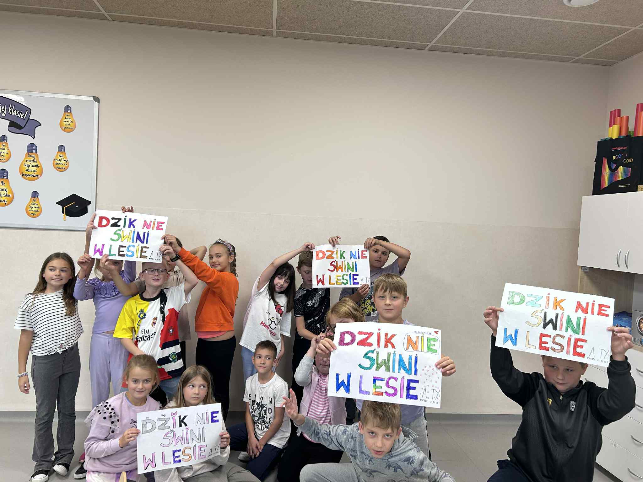 W klasach 2 i 3 odbyły się również lekcje edukacyjne, podczas których uczniowie pracowali z plakatem tegorocznej edycji akcji pod hasłem „Dzik nie świni w lesie”. Dzieci utrwalały zasady właściwego zachowania w naturze, poznały kodeks ekoturysty oraz rozwiązywały ciekawe łamigłówki i zadania ekologiczne.