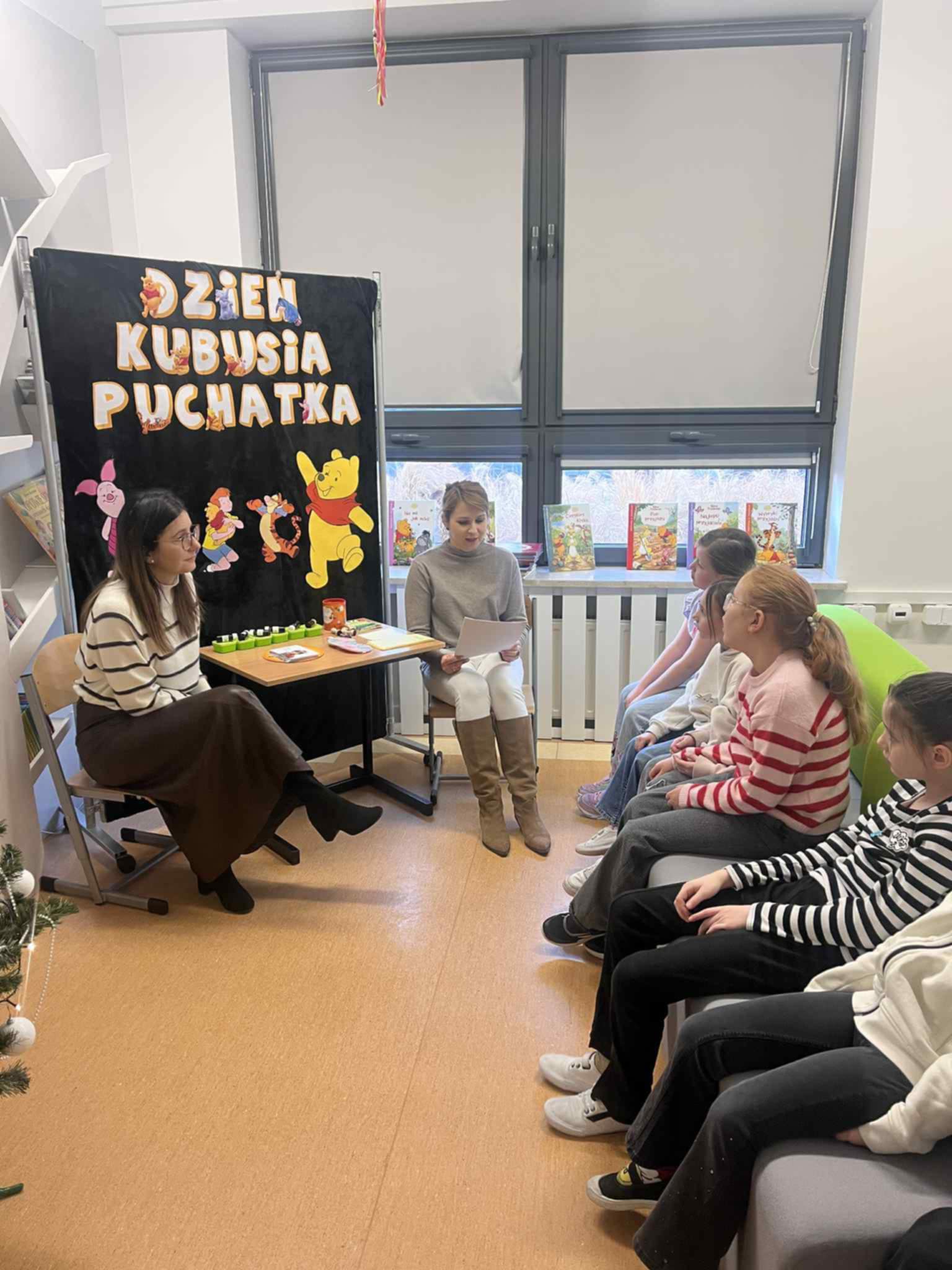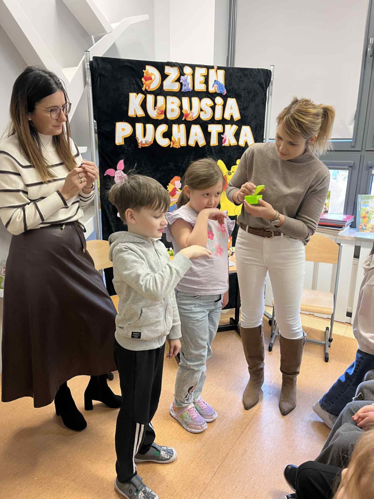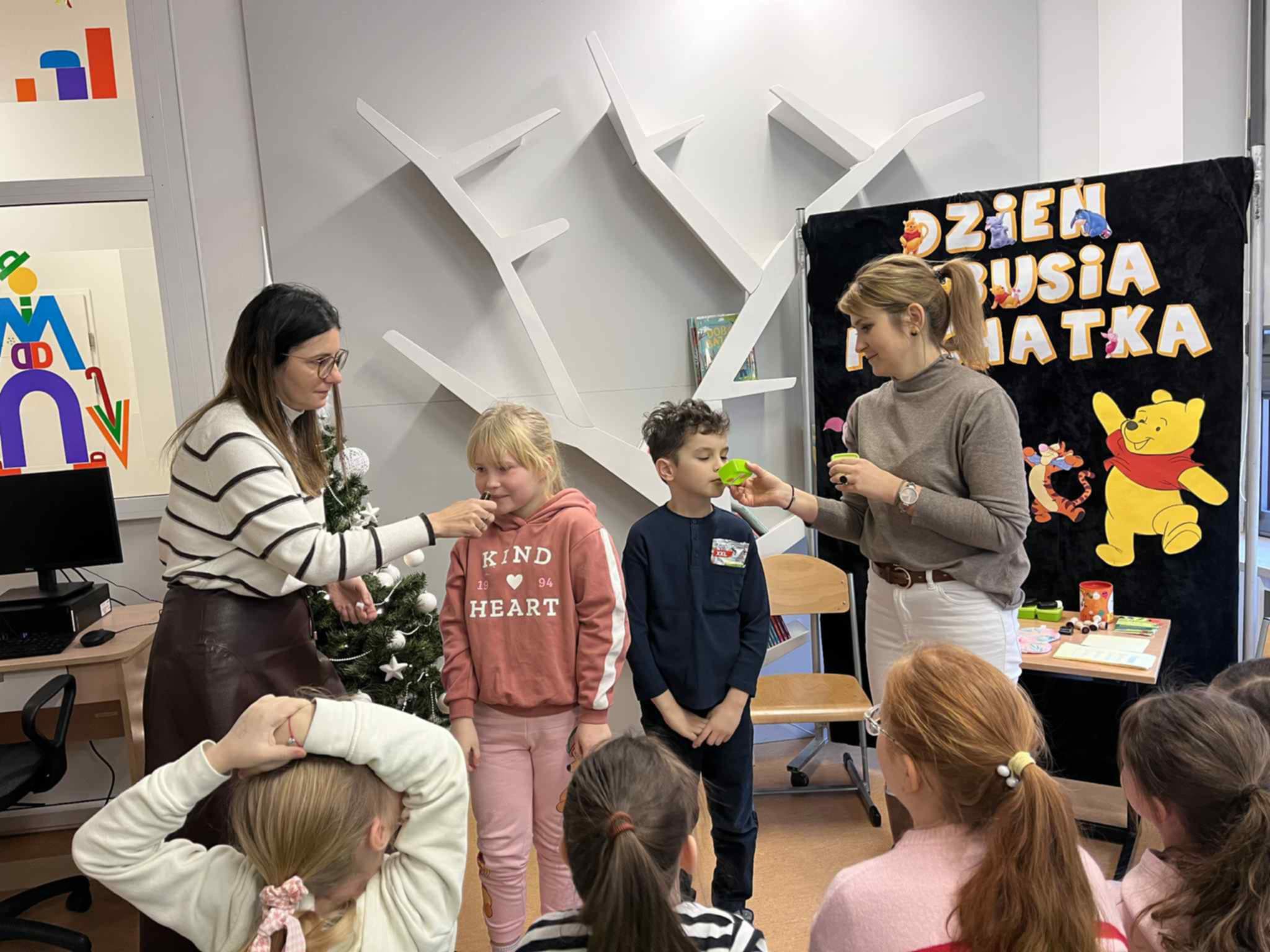 Tuż przed udaniem się na zasłużony odpoczynek podczas ferii zimowych, pierwszoklasiści uczestniczyli w kolejnym spotkaniu z bajką terapeutyczną. Rozpoczęło się ono od rozmowy kierowanej na temat ulubionych i nielubianych potraw. Dzieci chętnie dzieliły się swoimi doświadczeniami. Następnie prowadzące w przystępny sposób wyjaśniły, czym jest neofobia żywieniowa podkreślając, że obawa przed nowymi smakami jest czymś naturalnym, zwłaszcza u dzieci. W zrozumieniu tego dość trudnego zagadnienia pomógł znany już uczniom Miś Kuleczka- główny bohater przeczytanej podczas spotkania bajki pt. „ Kuleczka i zupa fasolowa, czyli historia z łyżką i odwagą”. Dzieci słuchały opowieści w skupieniu, starając się wyobrazić sobie opisywane sytuacje.