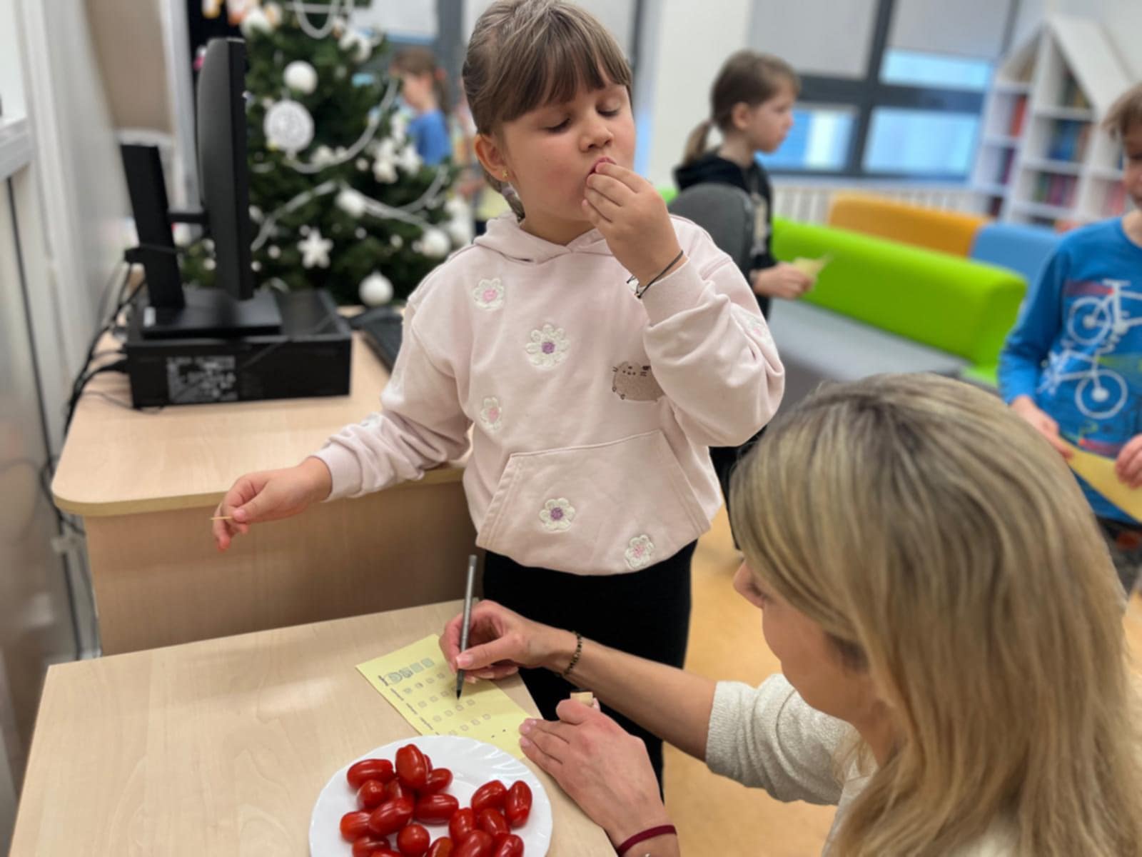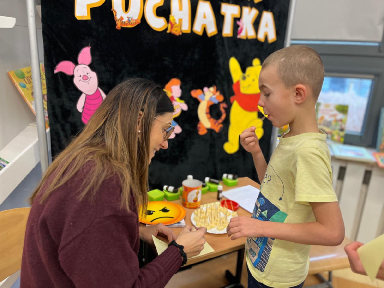 W dalszej części zajęć przeprowadzono ćwiczenie „Mały odkrywca smaków”. Uczniowie oglądali i opisywali pod względem koloru, zapachu i smaku różne produkty spożywcze (mandarynki, pomidorki koktajlowe, żółty ser, czekoladę). Każdy z uczniów otrzymał kartę odkrywcy do zbierania pieczątek- jeden stempel za spróbowanie jednego produktu. Obowiązywała zasada: można powąchać, dotknąć, polizać lub zjeść- każda podjęta próba była sukcesem. Naszym celem było oswojenie lęku, a nie przełamanie go siłą. Dzieci chętnie kosztowały niewielkich porcji produktów w bezpiecznej i wspierającej atmosferze. Podkreślano, że każdy ma prawo odmówić spróbowania, że nie wszystko musi smakować, ale zawsze warto próbować. Dzieci opowiadały, co im smakowało, a co nie. Na zakończenie nastąpiło wręczenie dyplomów „Małego odkrywcy smaków”.