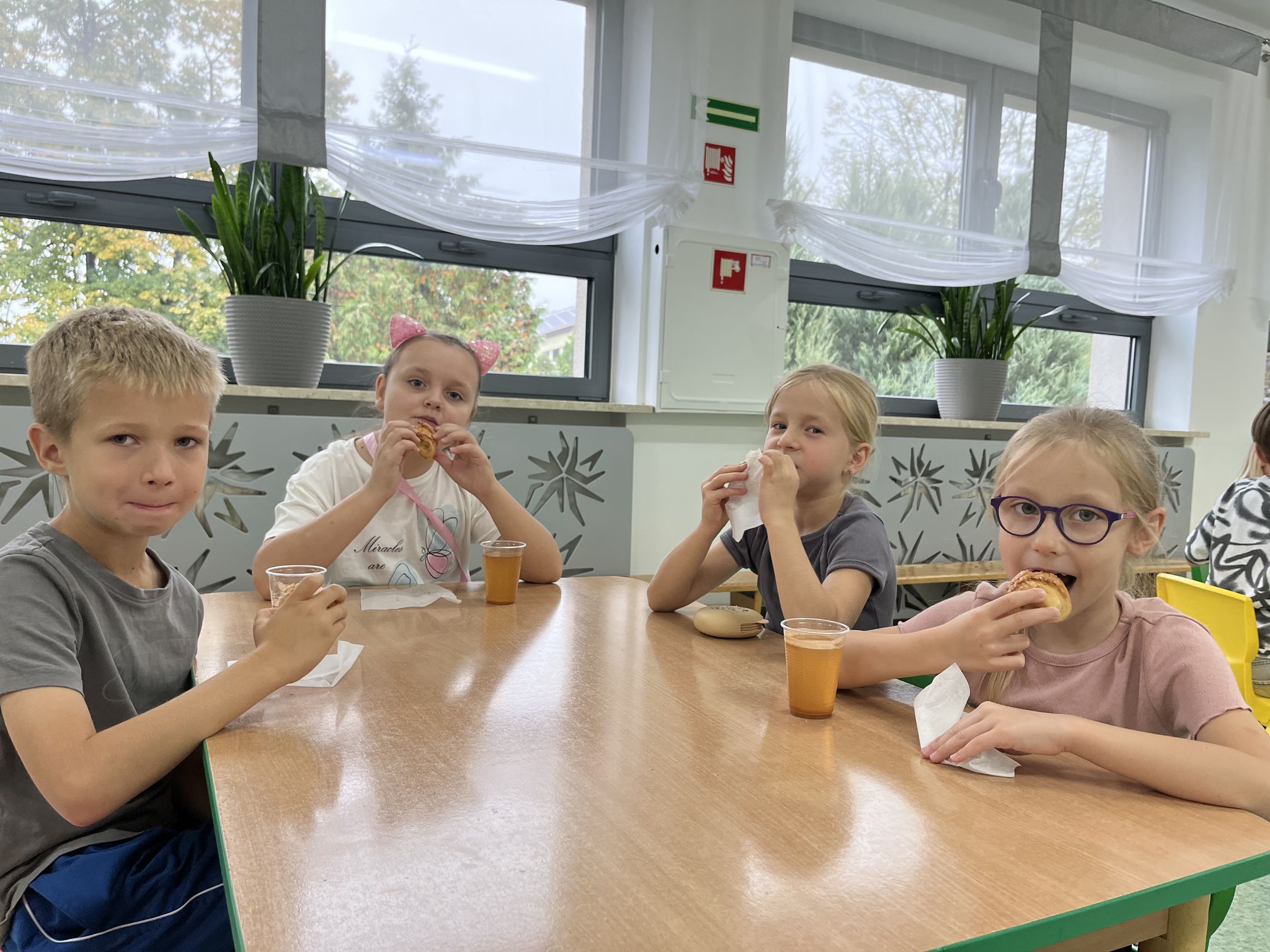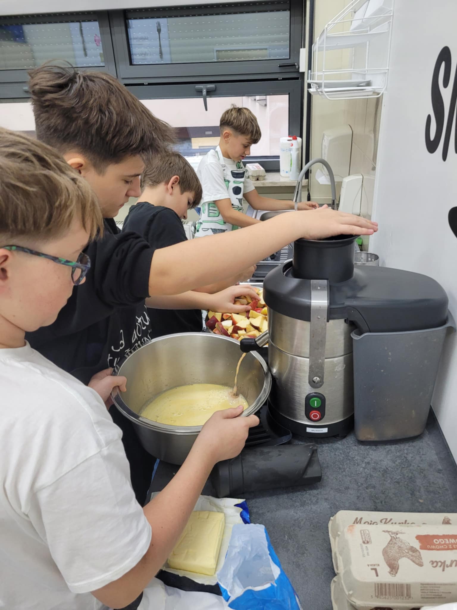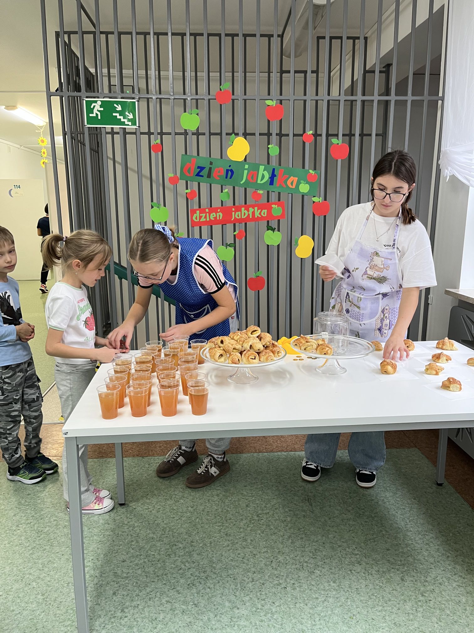Z tej okazji klasa 6 z dużym zaangażowaniem, wspólnie z opiekunami, przygotowywała rogaliki z jabłkami oraz świeżo wyciskany sok jabłkowy. Jabłka, z których korzystaliśmy, zostały przywiezione prosto z sadu w Sulmierzycach – były pachnące, świeże i idealne do wypieków. Po zakończeniu przygotowań wszyscy uczniowie mieli okazję spróbować pysznych rogalików i soku. Degustacja cieszyła się dużym zainteresowaniem – wszyscy z apetytem zajadali się wypiekami i napojem.