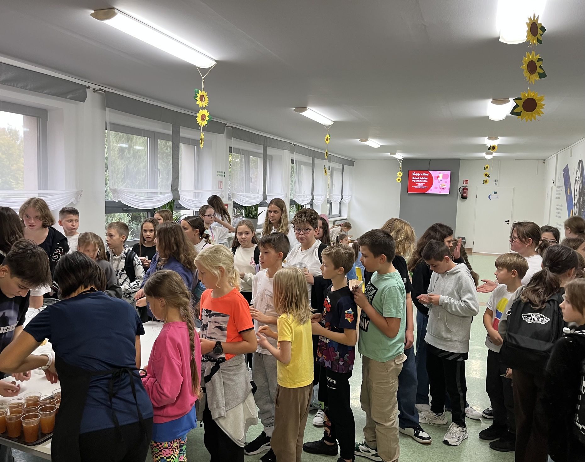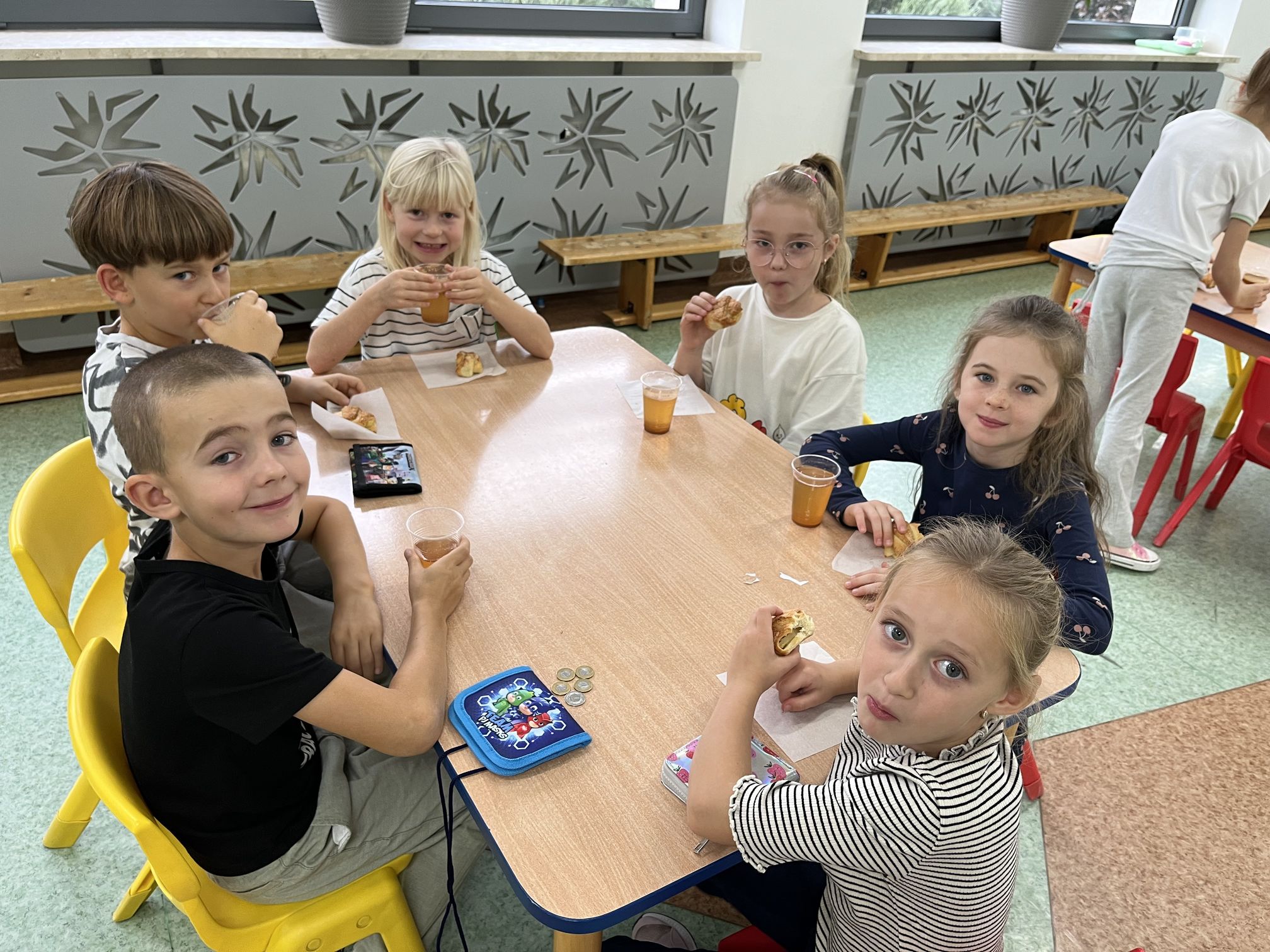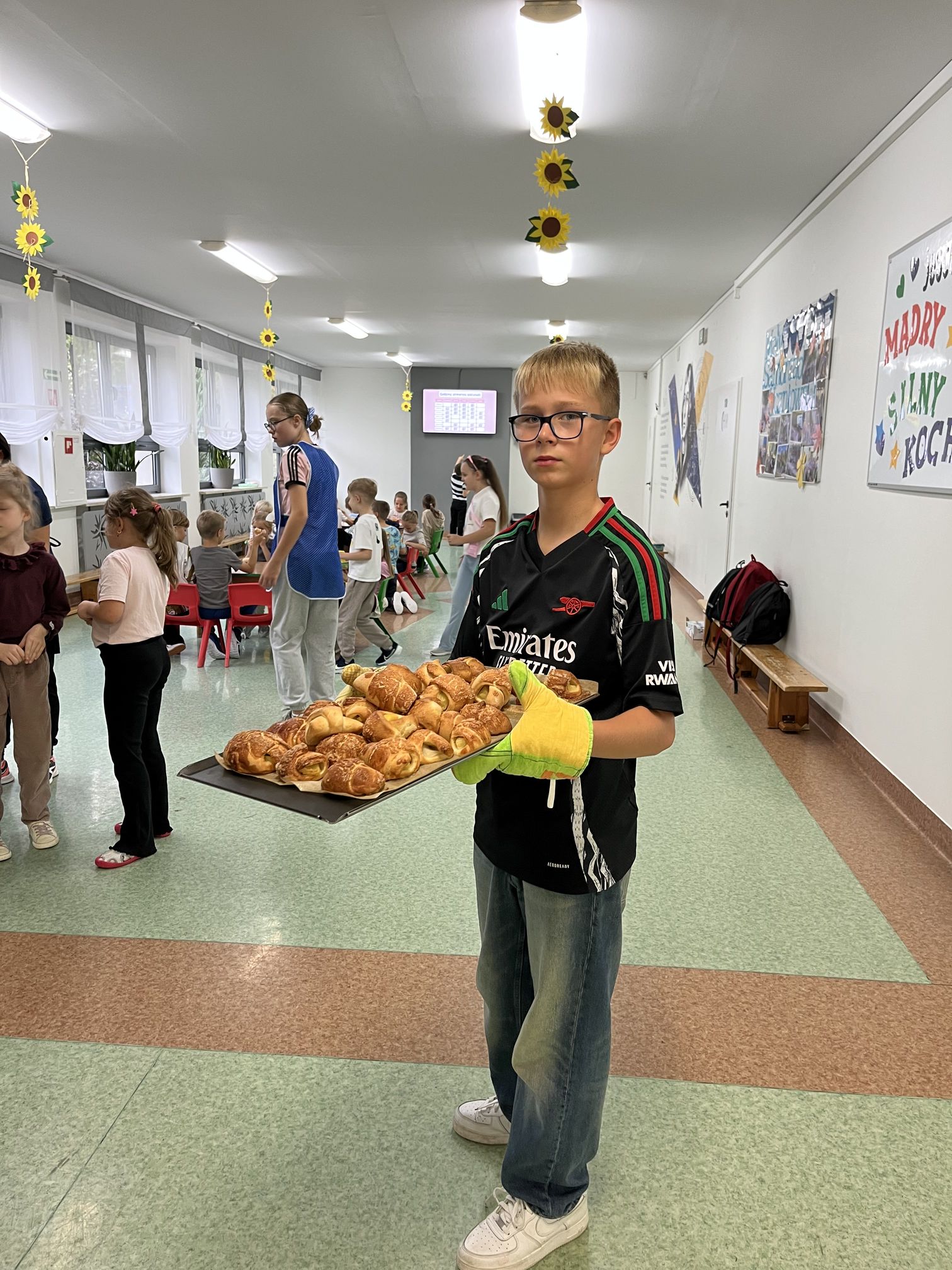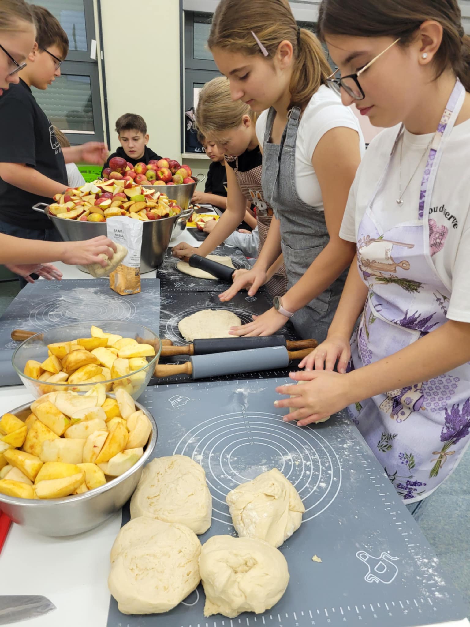 Z tej okazji klasa 6 z dużym zaangażowaniem, wspólnie z opiekunami, przygotowywała rogaliki z jabłkami oraz świeżo wyciskany sok jabłkowy. Jabłka, z których korzystaliśmy, zostały przywiezione prosto z sadu w Sulmierzycach – były pachnące, świeże i idealne do wypieków. Po zakończeniu przygotowań wszyscy uczniowie mieli okazję spróbować pysznych rogalików i soku. Degustacja cieszyła się dużym zainteresowaniem – wszyscy z apetytem zajadali się wypiekami i napojem.