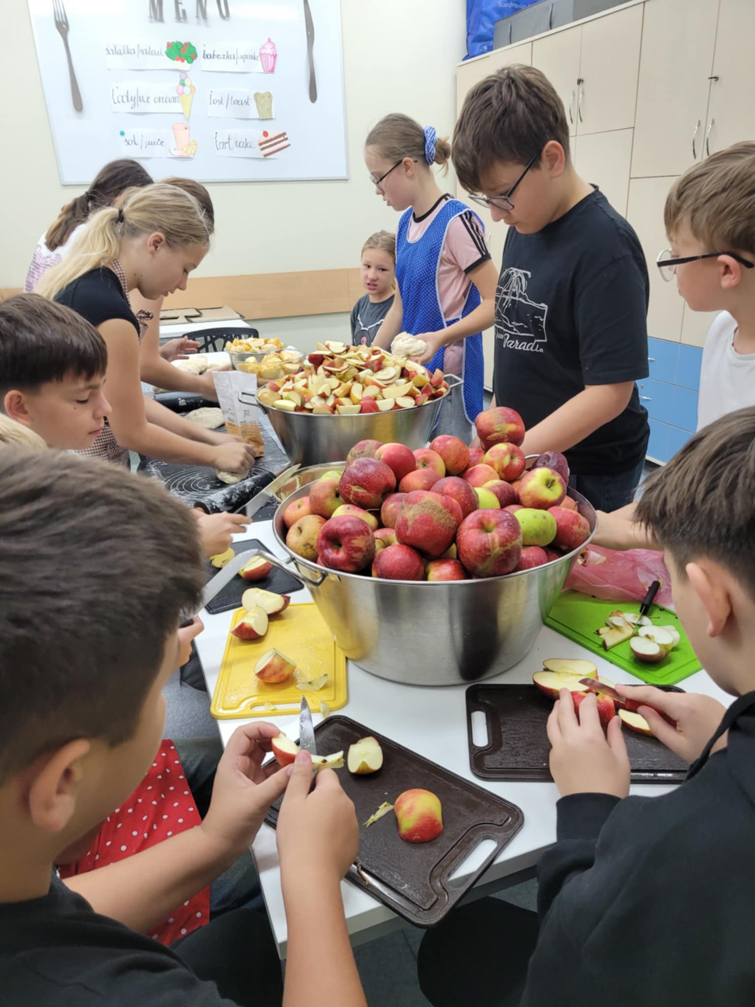 W wydarzeniu uczestniczyli także uczniowie klas pierwszych, którzy z zaciekawieniem poznawali budowę jabłka oraz badali je za pomocą różnych zmysłów: wzroku, dotyku, zapachu i smaku. Mali odkrywcy z zainteresowaniem obserwowali również, jak ich starsi koledzy przygotowują jabłkowe przysmaki.