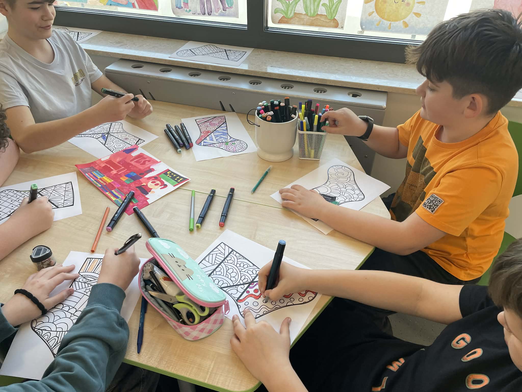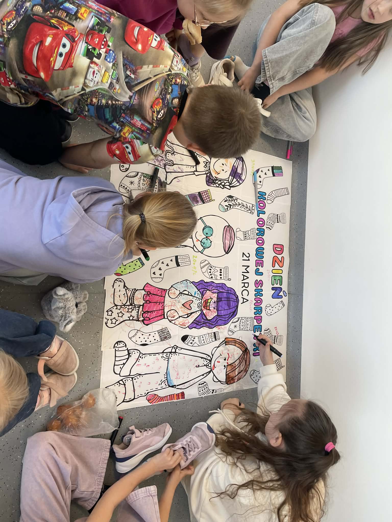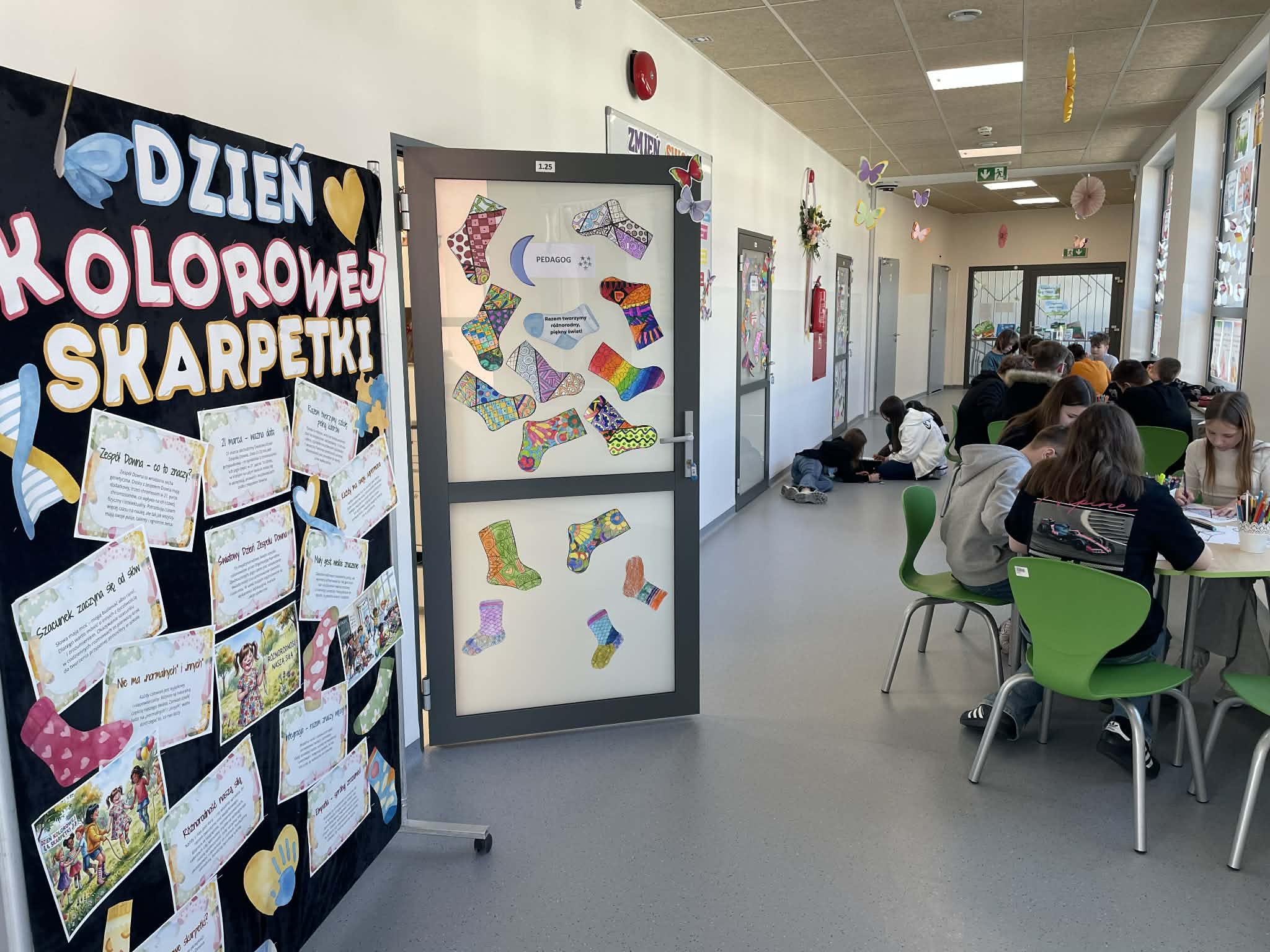 Nasi szkolni specjaliści oraz nauczyciele wspomagający przygotowali dla uczniów twórcze aktywności – wspólne malowanie kolorowych skarpetek, które na zakończenie dnia stworzyły barwną dekorację szkolnego korytarza. Dzięki zaangażowaniu dzieci oraz nauczycieli powstała przestrzeń pełna radości i pozytywnej energii.