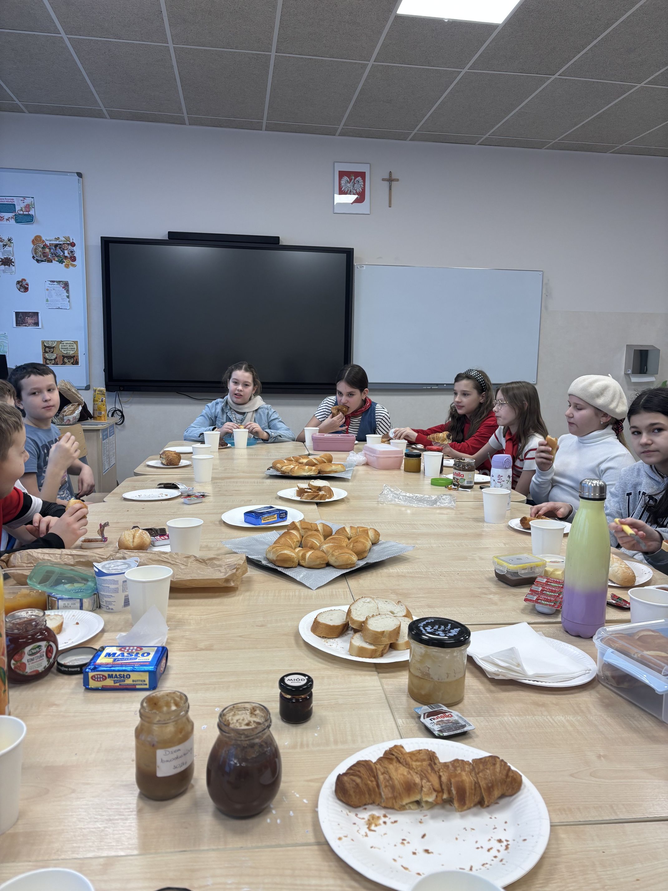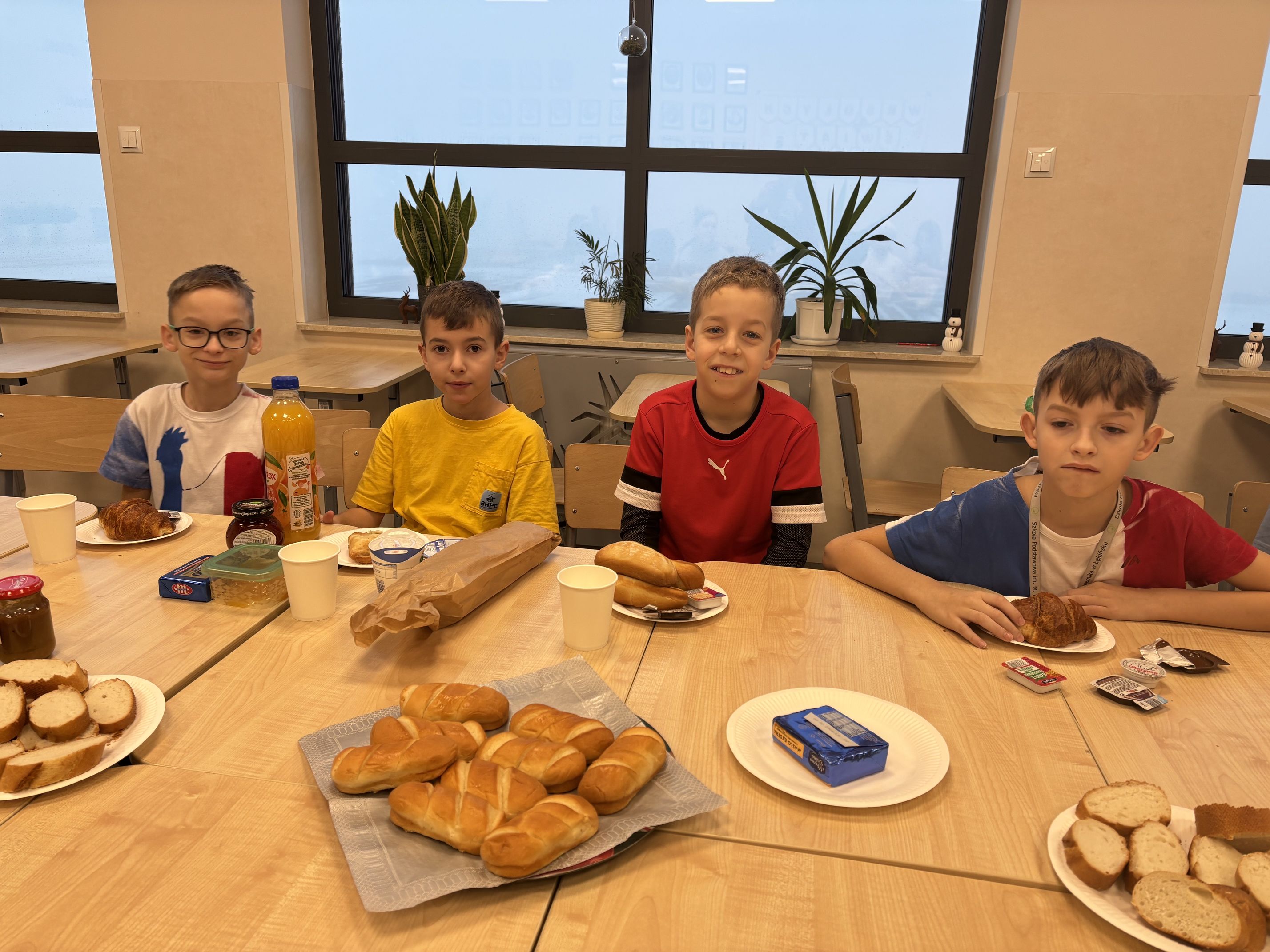 W ramach pierwszego spotkania z sympatycznym francuskim kolegą z lektury R. Goscinnego i J.J. Sempé, czyli Mikołajkiem, uczniowie klasy 4 a wraz z nauczycielką języka polskiego zorganizowali francuskie śniadanie.