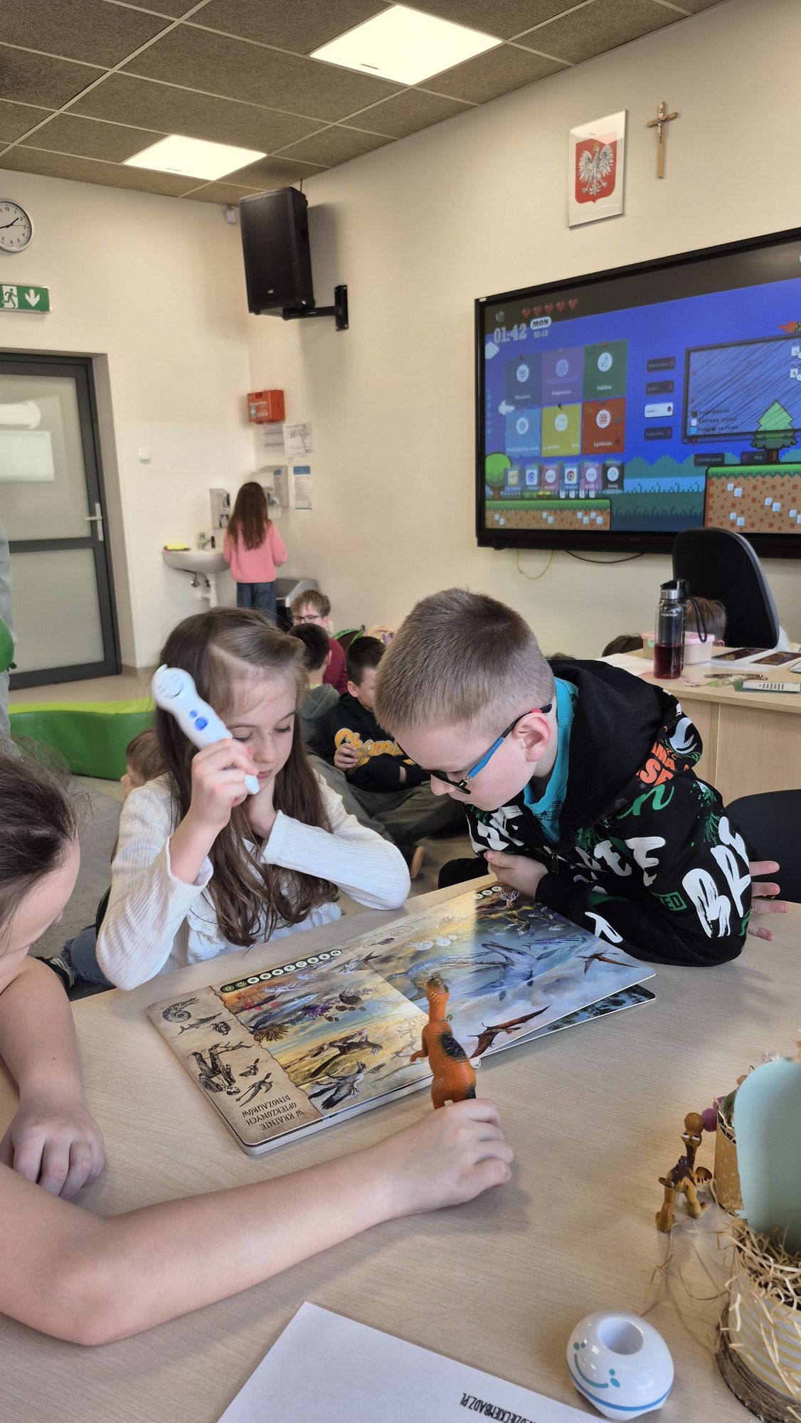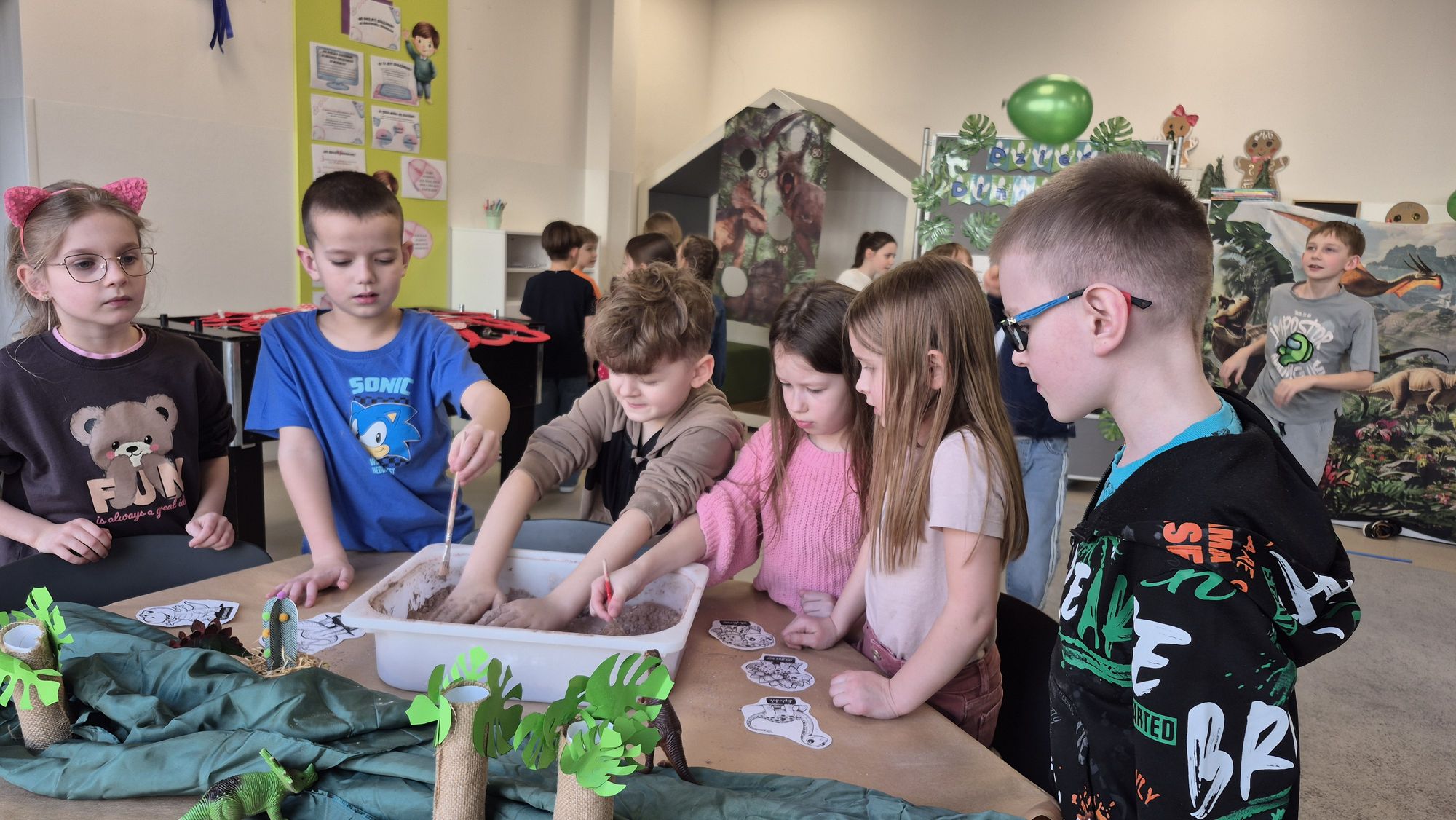 Podczas zabawy z latarką uczniowie odkrywali, które dinozaury były roślinożerne, mięsożerne, a które żywiły się rybami. Dużo emocji wzbudziła także zabawa w paleontologa z wykorzystaniem masy sensorycznej, w której dzieci „odkopywały” ukryte skamieniałości.