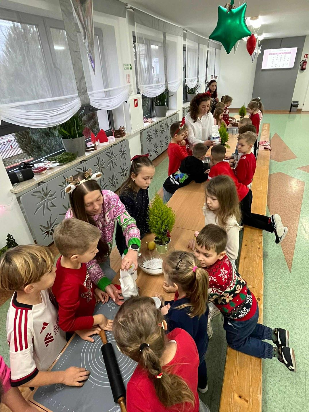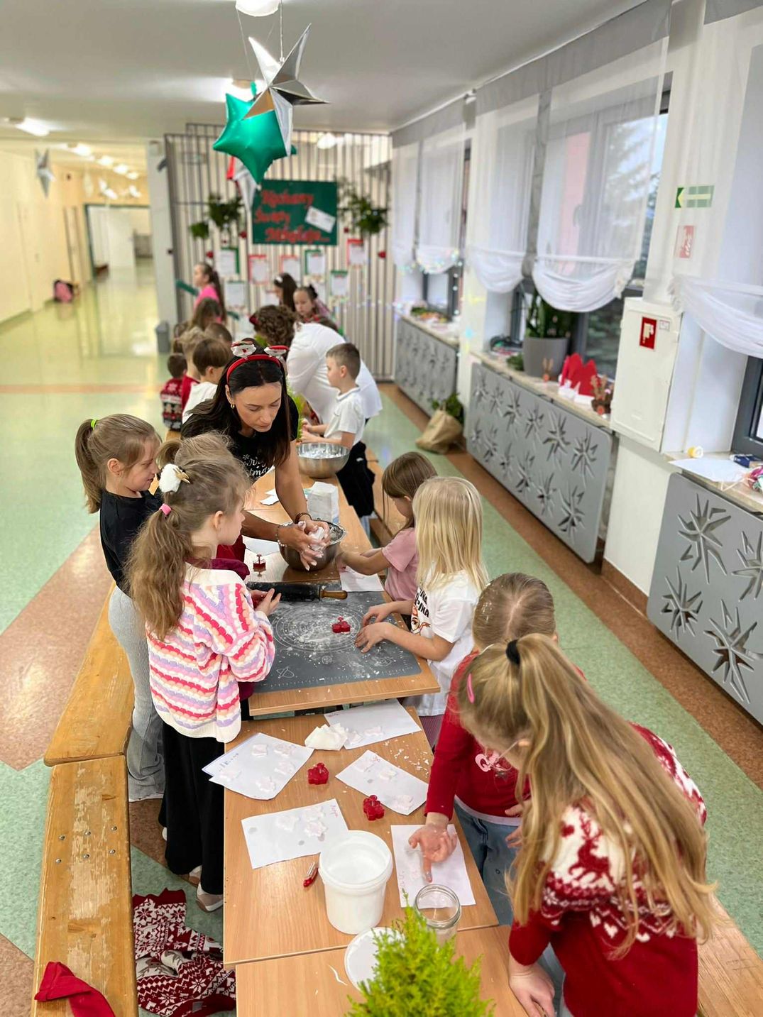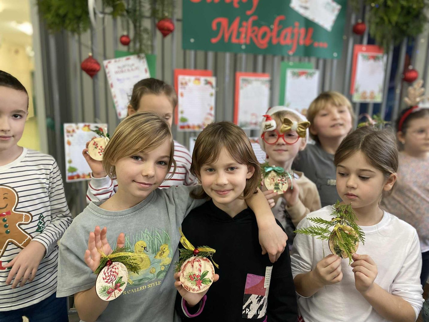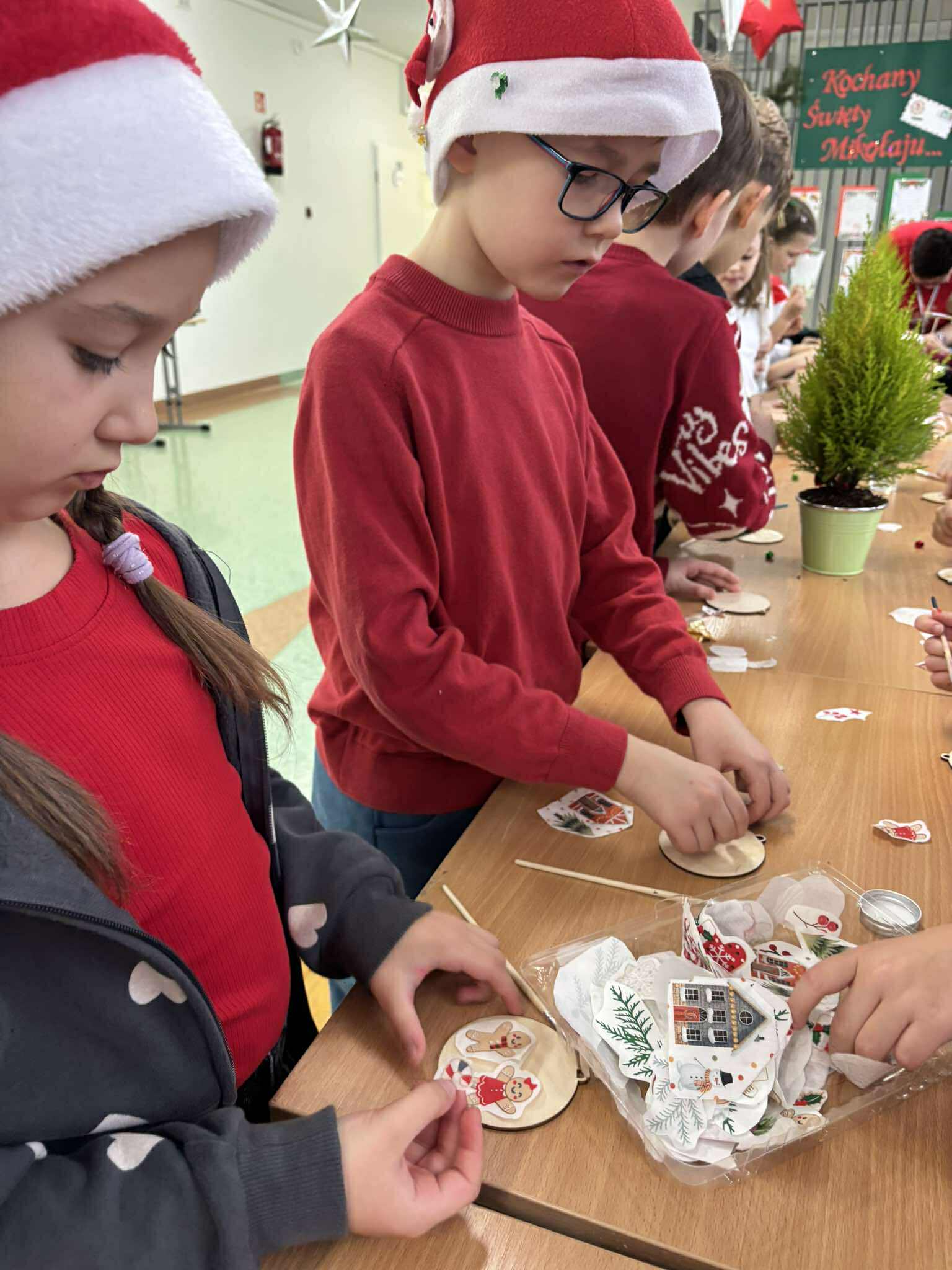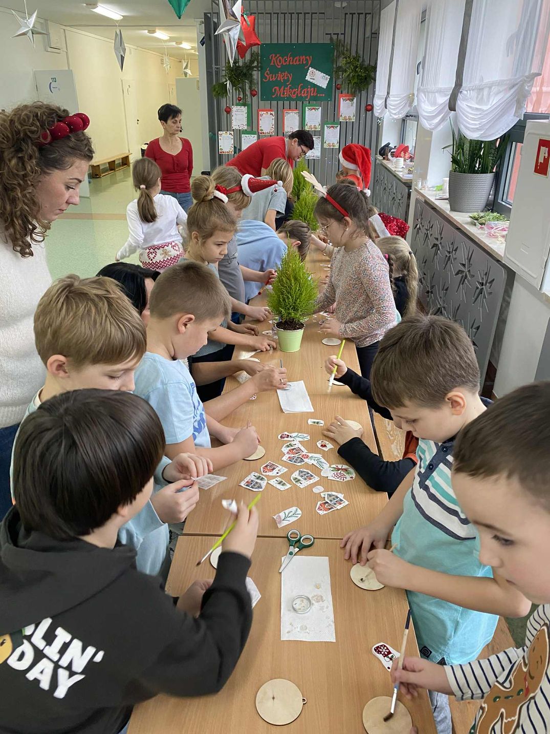 W tym tygodniu nauczyciele świetlicy zorganizowali dla uczniów klas 1-3 wyjątkowe Mikołajki. Wydarzenie, to miało charakter warsztatowy angażując wszystkie klasy 1-3 w twórcze przygotowania ozdób bożonarodzeniowych. Klasy pierwsze z wielkim zapałem przygotowywały porcelanowe pierniczki, najpierw zapoznali się z przepisem na taką masę i zgodnie wykonywali zadanie krok po kroku, tworząc przy tym wspaniałe białe, ceramiczne i brokatowe ozdoby, które na pewno zawisną na tegorocznej choince. Klasy drugie skupiły się na technice decoupage'u. Uczniowie wycinali świąteczne motywy z serwetek i pięknie zdobili swoje drewniane bombki rozwijając przy tym wrażliwość artystyczną i zdolności manualne.