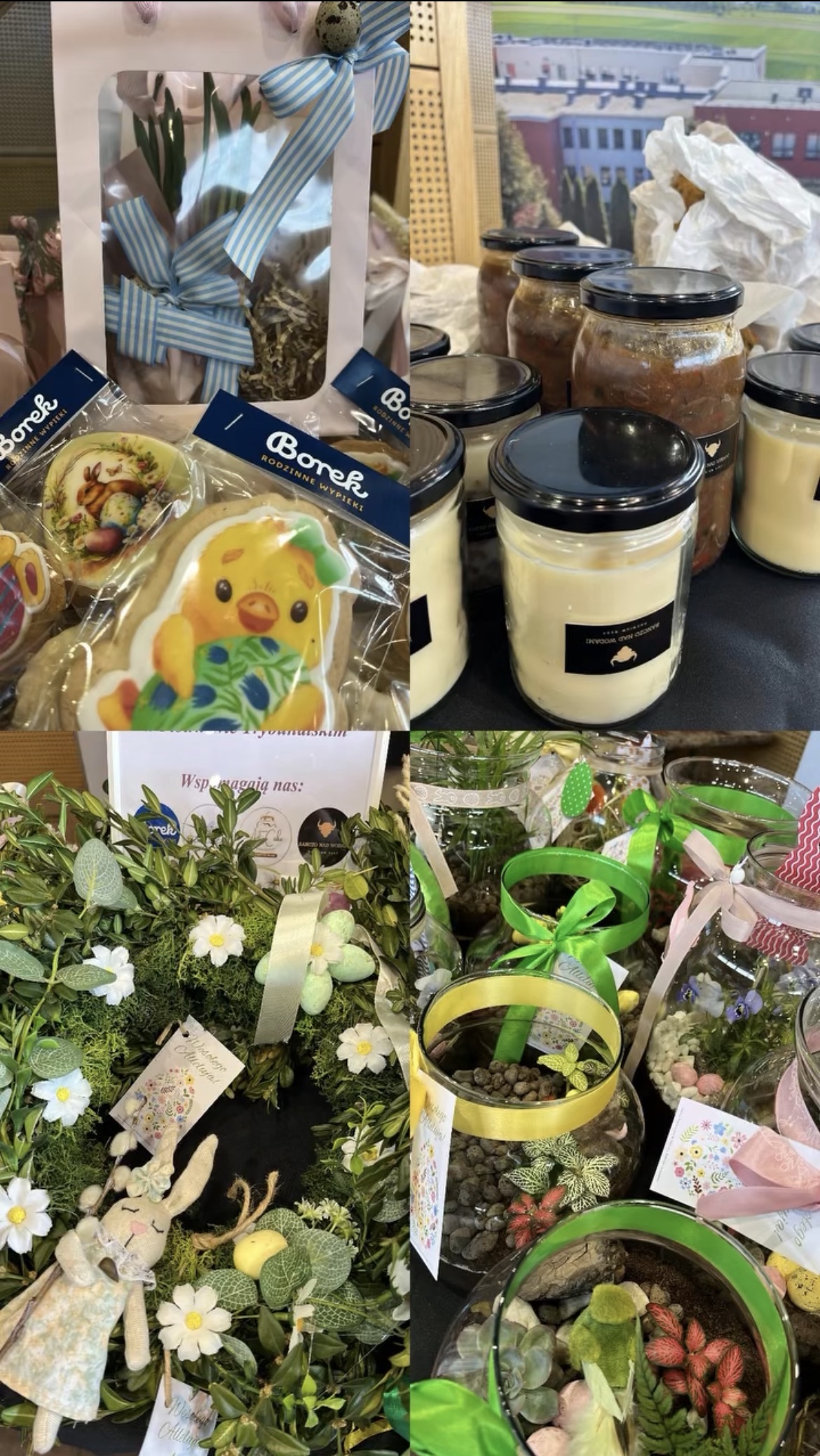 Dużym zainteresowaniem cieszyły się także stoiska przygotowane przez społeczność szkolną. Można było na nich zakupić pyszne ciasta i wypieki przygotowane przez rodziców naszych uczniów. Nie zabrakło również pięknych ozdób wielkanocnych powstałych podczas szkolnych warsztatów pod czujnym okiem wychowawców. Wśród nich znalazły się stroiki, ręcznie wykonane dekoracje, sojowe świece oraz słoje z żywymi kwiatami, które zachwycały swoją starannością i pomysłowością.