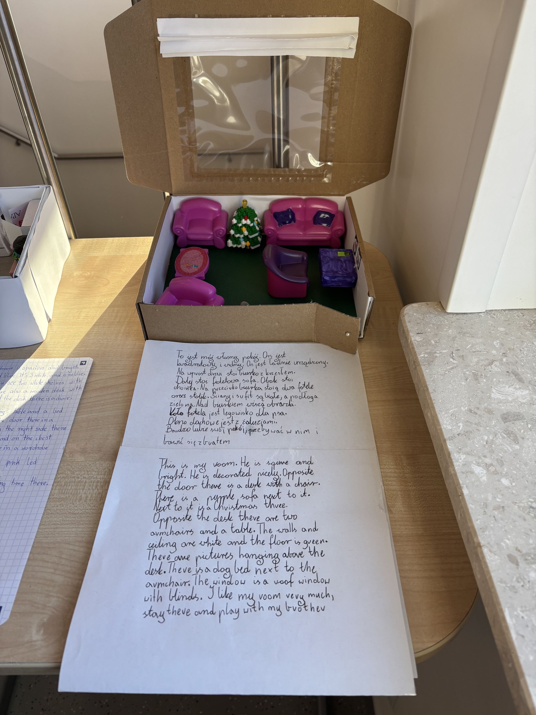 Projekt był realizowany w dwóch etapach. W części plastycznej uczniowie wykonali rysunki swoich pokoi lub przestrzenne makiety z kartonu i innych materiałów. Prace wyróżniały się pomysłowością, estetyką oraz dbałością o najmniejsze szczegóły, takie jak rozmieszczenie mebli czy ulubione przedmioty. W etapie językowym uczniowie przygotowali opisy swoich pokoi w języku polskim i angielskim, zgodne z treściami omawianymi na lekcjach. Teksty zostały dołączone do prac plastycznych.