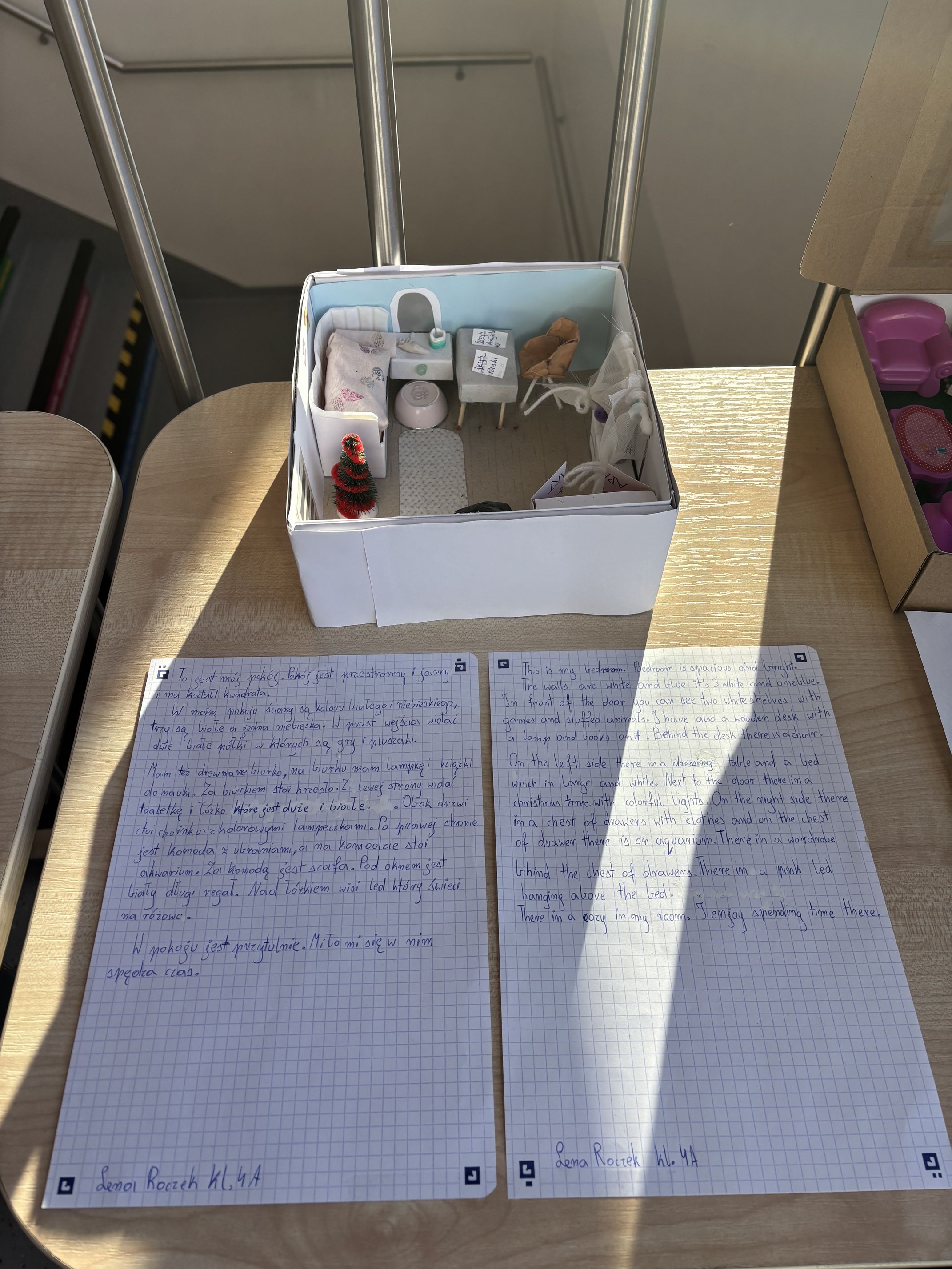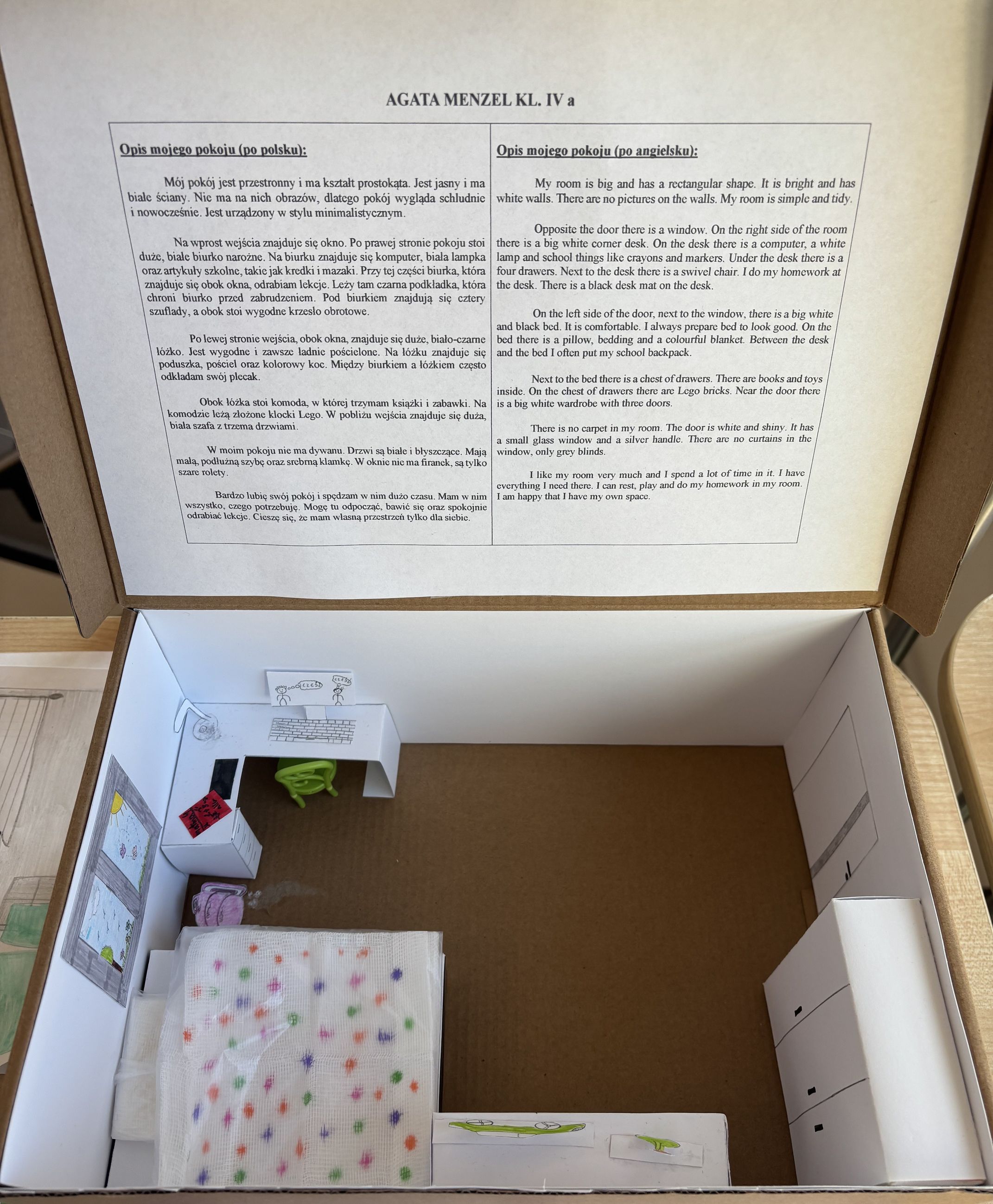 Uczniowie klasy 4 a mieli okazję wziąć udział w interdyscyplinarnym projekcie edukacyjnym „Mój pokój – My room!”, łączącym treści z języka polskiego i języka angielskiego. Jego celem było rozwijanie kreatywności, umiejętności plastycznych oraz kompetencji językowych uczniów, w szczególności wzbogacanie słownictwa i ćwiczenie opisu przestrzeni w dwóch językach.
