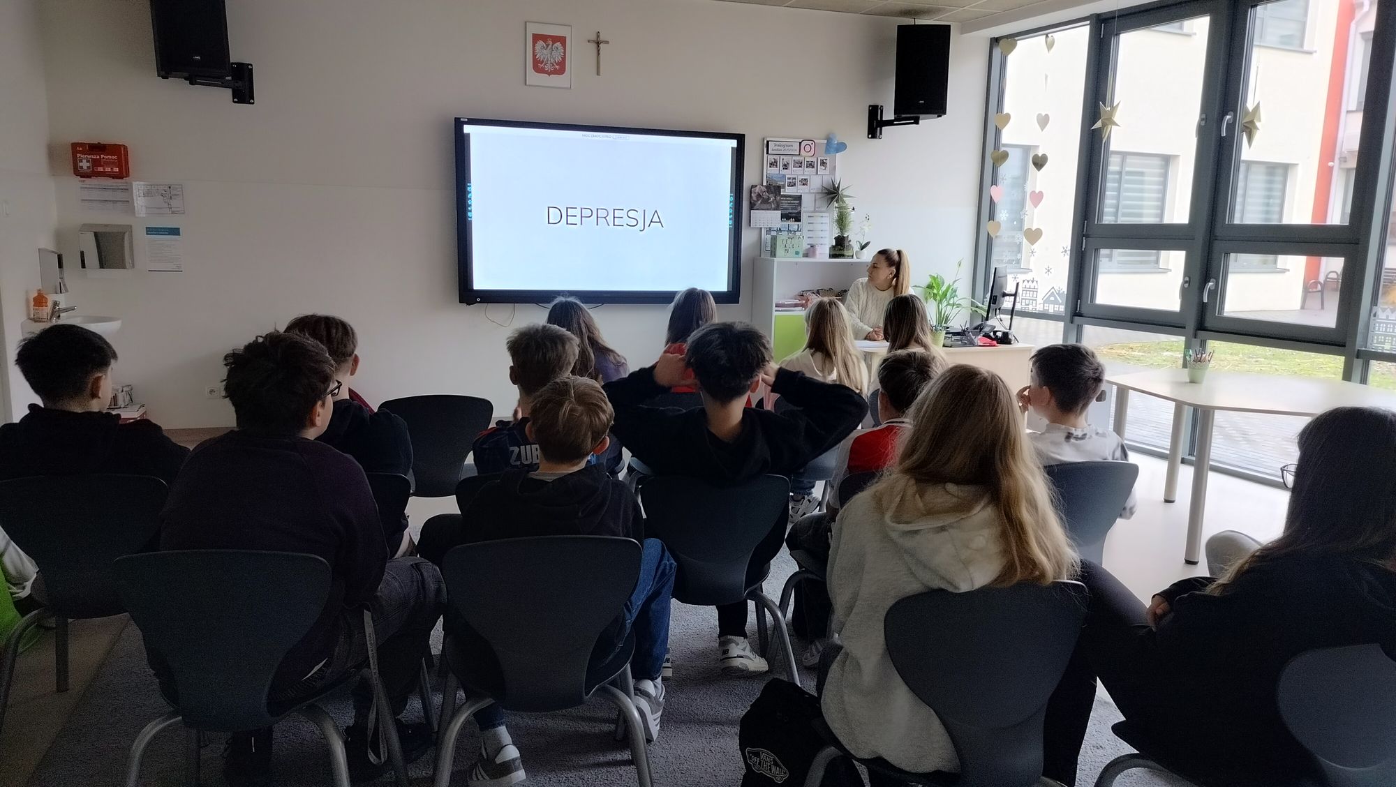 23 lutego w naszej szkole obchodziliśmy Światowy Dzień Walki z Depresją – dzień szczególnie ważny, ponieważ przypomina, jak istotna jest troska o zdrowie psychiczne, wzajemna uważność oraz reagowanie na trudności emocjonalne innych osób. Z tej okazji Zespół pomocy psychologiczno-pedagogicznej przeprowadził w klasach starszych zajęcia profilaktyczne poświęcone tematyce depresji. Podczas spotkań uczniowie dowiedzieli się, czym jest to zaburzenie, jakie są jego najczęstsze objawy oraz jakie sygnały mogą świadczyć o tym, że ktoś z bliskiego otoczenia potrzebuje wsparcia. Rozmawiano także o sposobach leczenia, możliwościach uzyskania profesjonalnej pomocy, a przede wszystkim o tym, jak rozmawiać z osobą w kryzysie i jak samemu radzić sobie z trudnymi emocjami. Zajęcia miały charakter otwartej rozmowy, sprzyjały zadawaniu pytań i dzieleniu się refleksjami, dzięki czemu uczniowie mogli poczuć, że ich emocje są ważne i że nie są sami ze swoimi trudnościami.