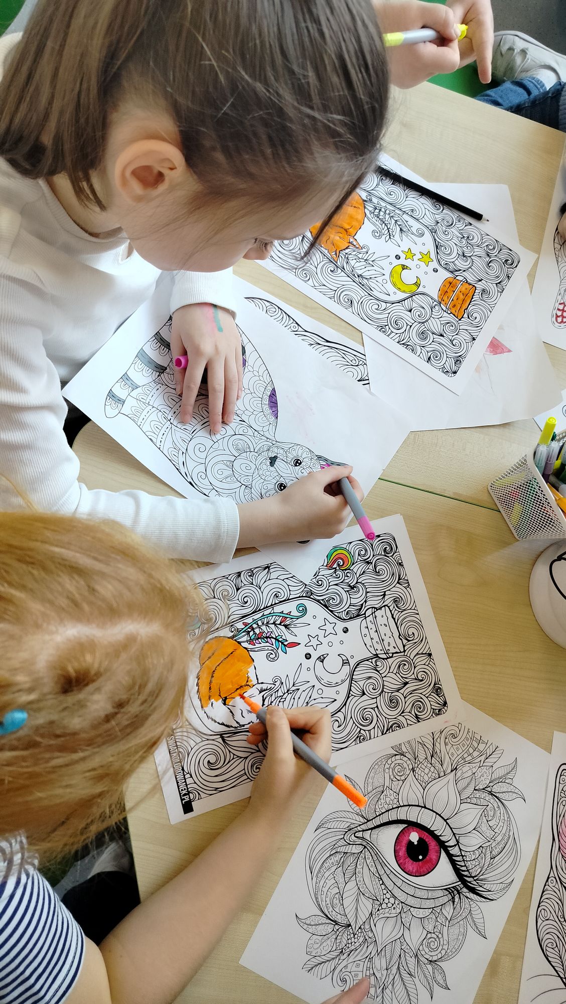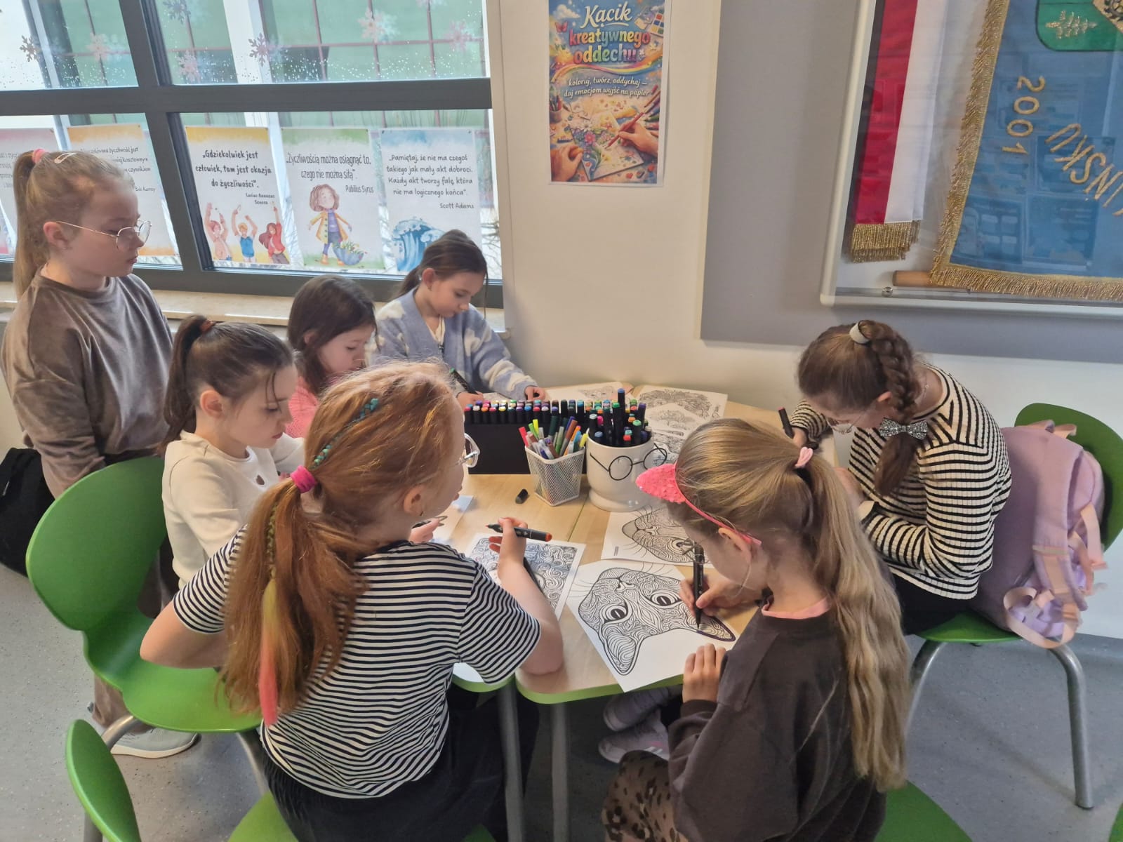 „Kącik kreatywnego oddechu” zapraszał słowami „Koloruj, twórz, oddychaj – daj emocjom wyjść na papier”. Znajdowały się tam kolorowanki antystresowe, kartki i przybory plastyczne. Uczniowie mogli swobodnie rysować, kolorować i tworzyć własne prace, co pomagało rozładować napięcie, wyrazić emocje w bezpieczny sposób i pobudzić wyobraźnię. Dla wielu była to okazja do chwili spokojnej, twórczej aktywności w środku intensywnego dnia.