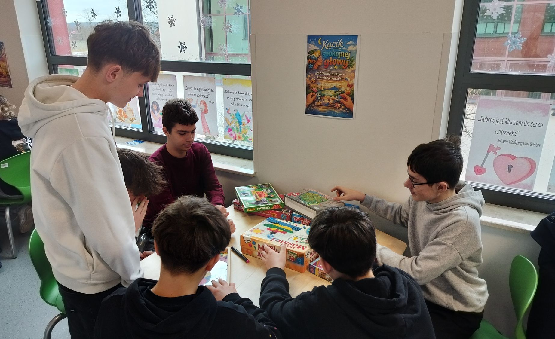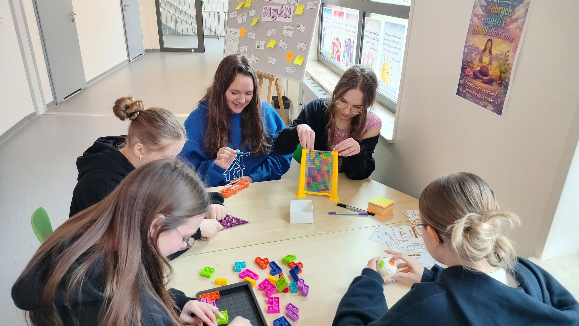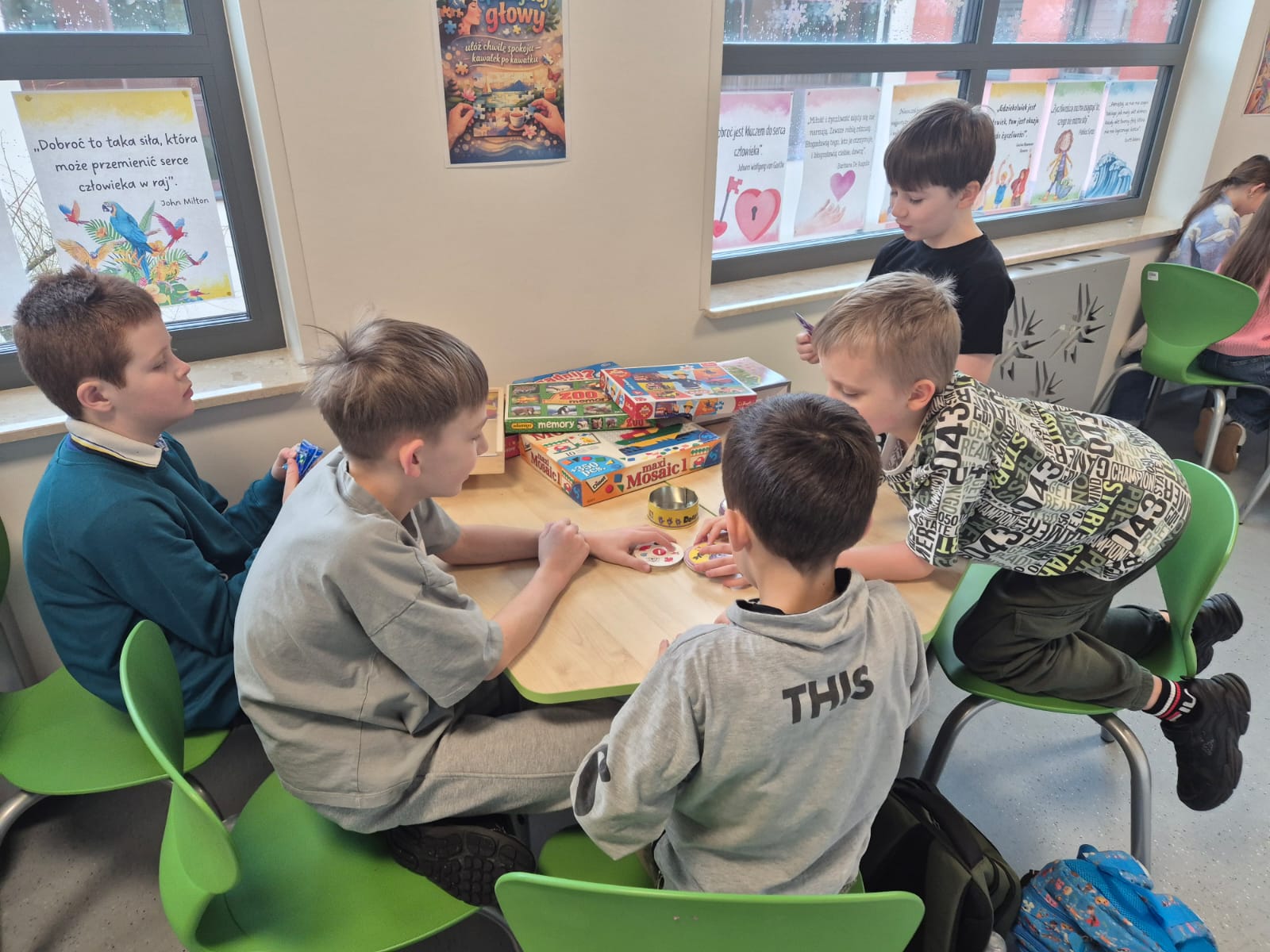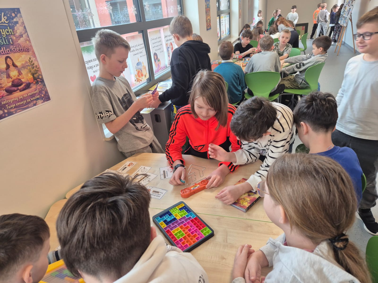 „Kącik spokojnej głowy” – pod hasłem „Ułóż chwilę spokoju – kawałek po kawałku” – oferował puzzle, układanki logiczne i tangramy. Proste, angażujące zadania pozwalały na chwilę zatrzymać się, skupić uwagę na działaniu „tu i teraz”, wyciszyć natłok myśli oraz doświadczyć poczucia sukcesu po ukończeniu zadania. Była to przestrzeń szczególnie chętnie odwiedzana przez uczniów potrzebujących krótkiej przerwy od szkolnego zgiełku.