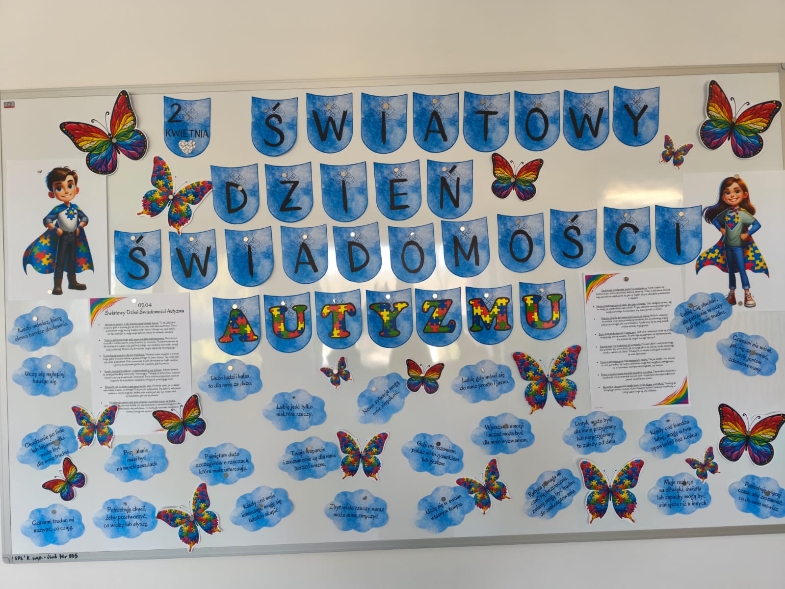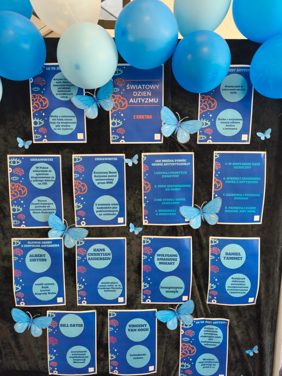 Obchody Światowego Dnia Autyzmu w naszej szkole miały wyjątkowy i bardzo uroczysty charakter. Już od samego rana można było zauważyć tematyczne dekoracje w odcieniach koloru niebieskiego, które symbolizują solidarność z osobami w spektrum autyzmu. Sale lekcyjne oraz korytarze zostały ozdobione plakatami, balonami i pracami nawiązującymi do tej ważnej tematyki.
