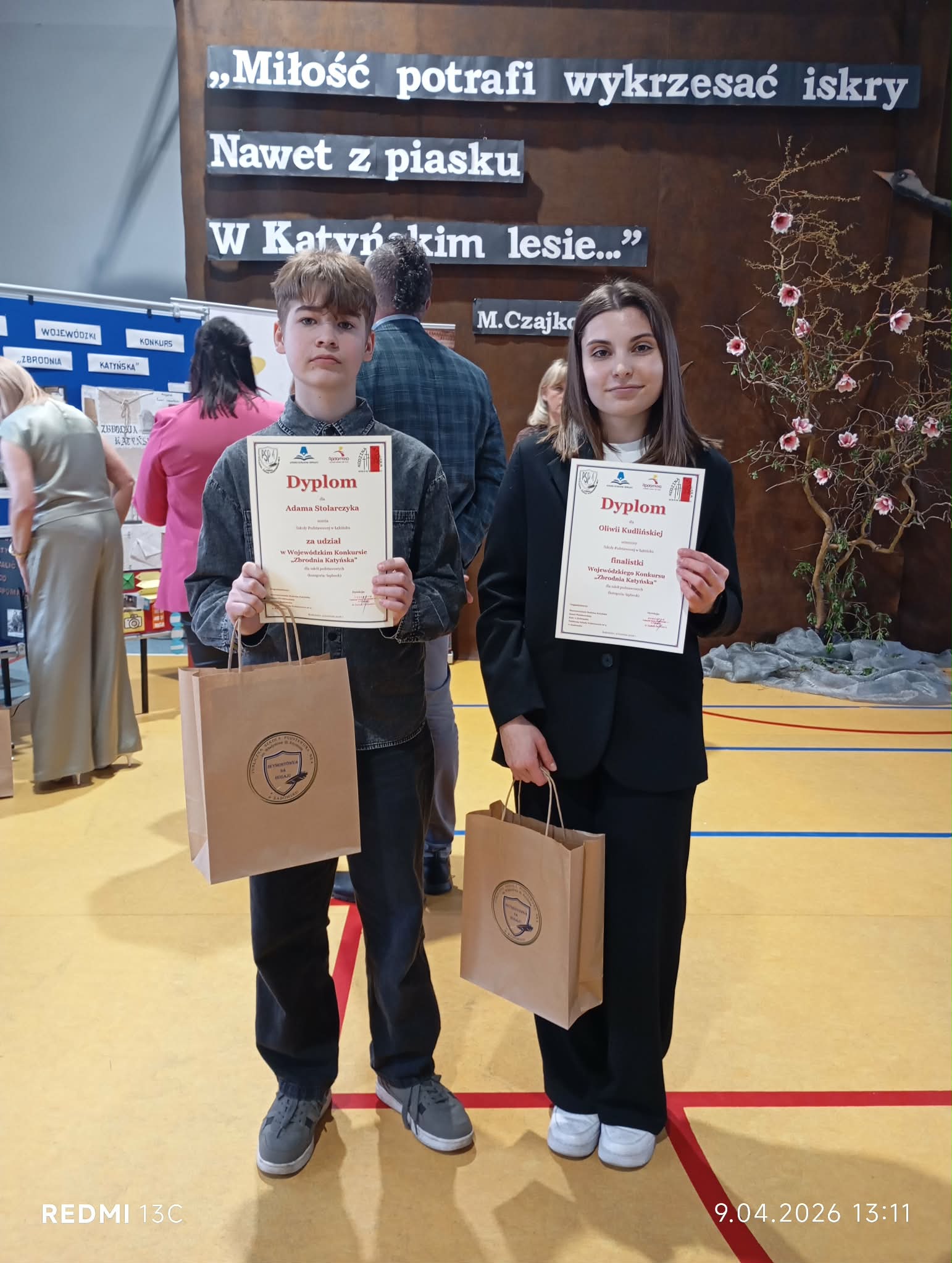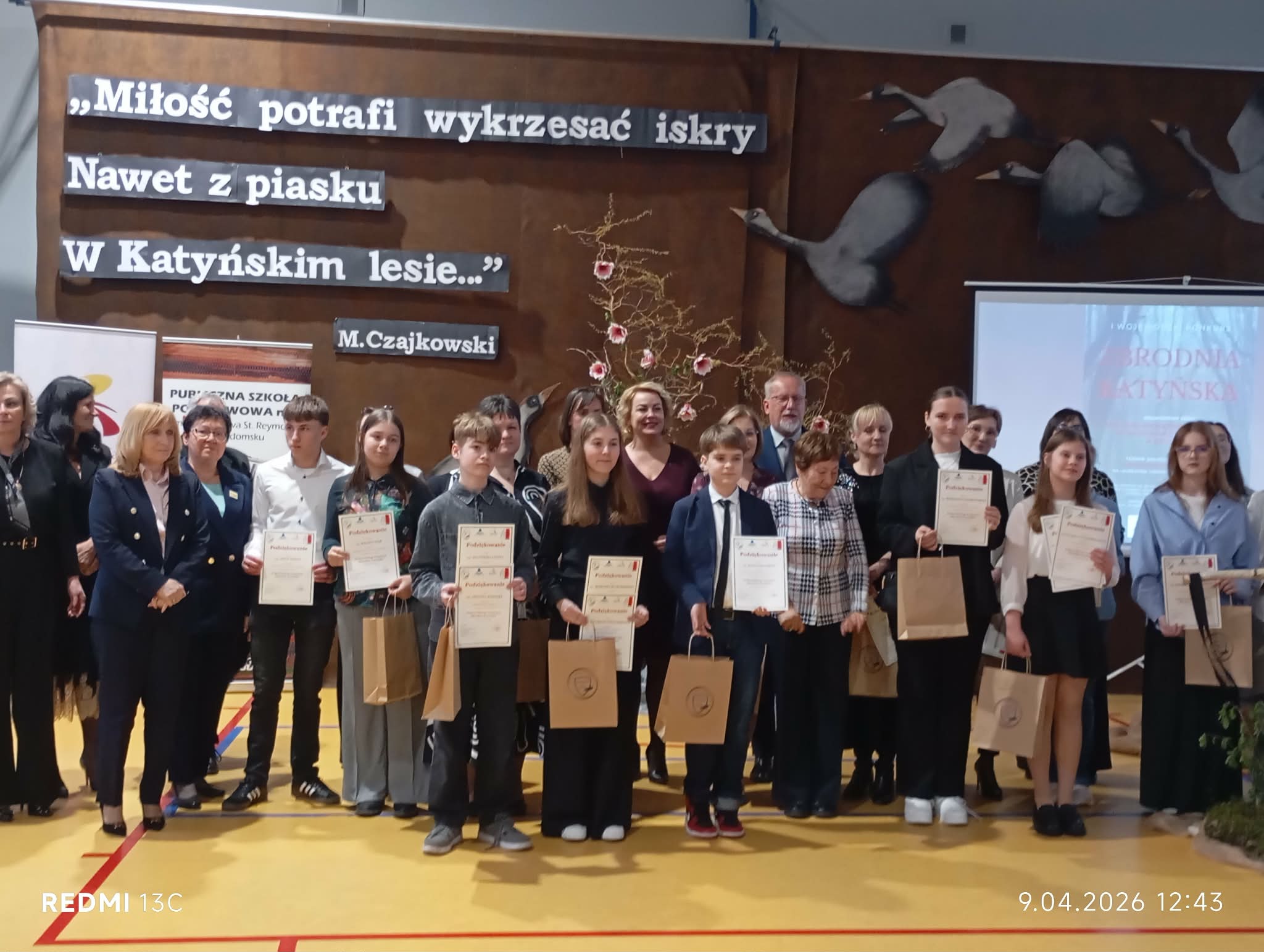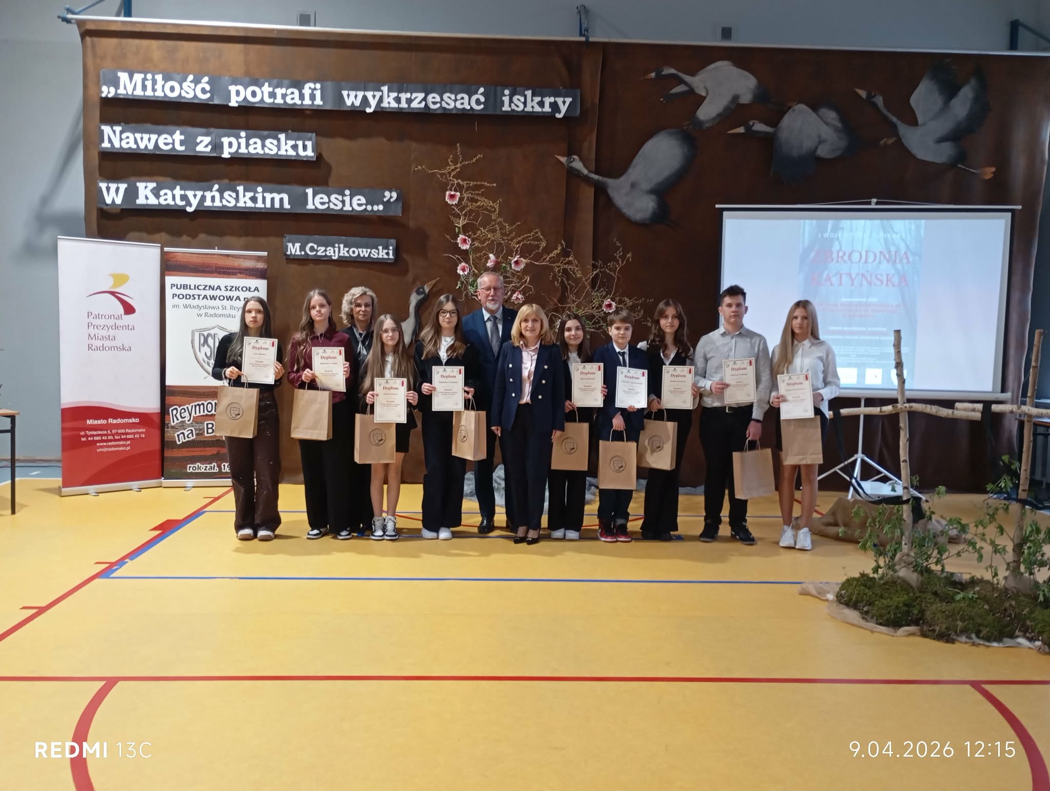 9 kwietnia 2026 r. odbyła się gala rozdania nagród w I Wojewódzkim Konkursie "Zbrodnia Katyńska", który odbył się po raz pierwszy w Publicznej Szkole Podstawowej nr 4 w Radomsku, a jest kontynuacją ponad dwudziestoletniego Powiatowego Konkursu Katyńskiego. W tym roku honorowy patronat nad konkursem objął Łódzki Kurator Oświaty, Prezydent Miasta Radomsko oraz Rodzina Katyńska Koło w Radomsku. W konkursie wzięło udział 276 uczniów z 55 szkół podstawowych województwa łódzkiego. Zadaniem uczestników było przygotowanie pracy plastycznej nawiązującej swą tematyką do tytułu konkursu. Naszą szkołę w konkursie reprezentowali: Ewa Stolarczyk z kl. 8 b, Adam Stolarczyk z kl. 6 b oraz Oliwia Kudlińska z kl. 8 a. Uczennica Oliwia Kudlińska została jego finalistką, co stanowi duże wyróżnienie i powód do dumy dla całej społeczności szkolnej. Serdecznie gratulujemy!