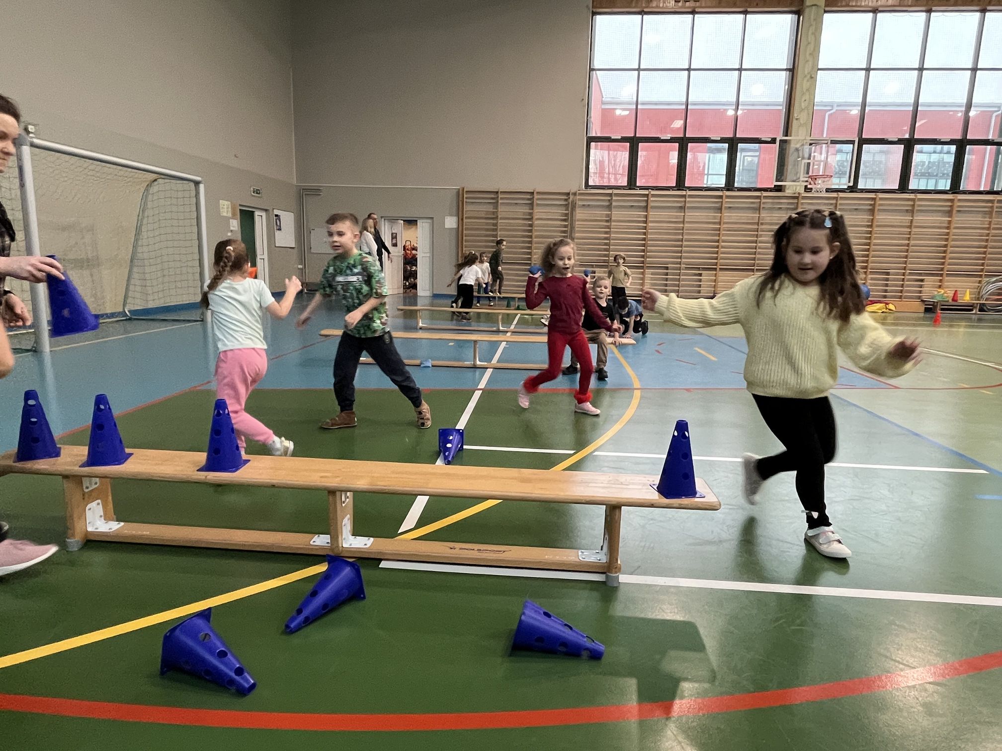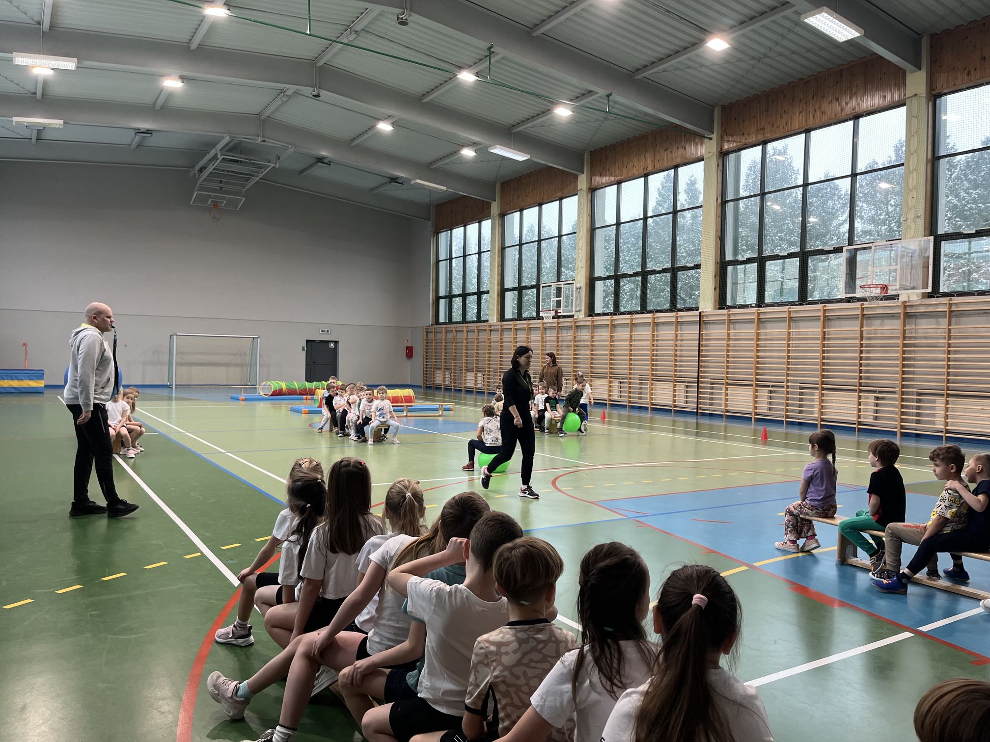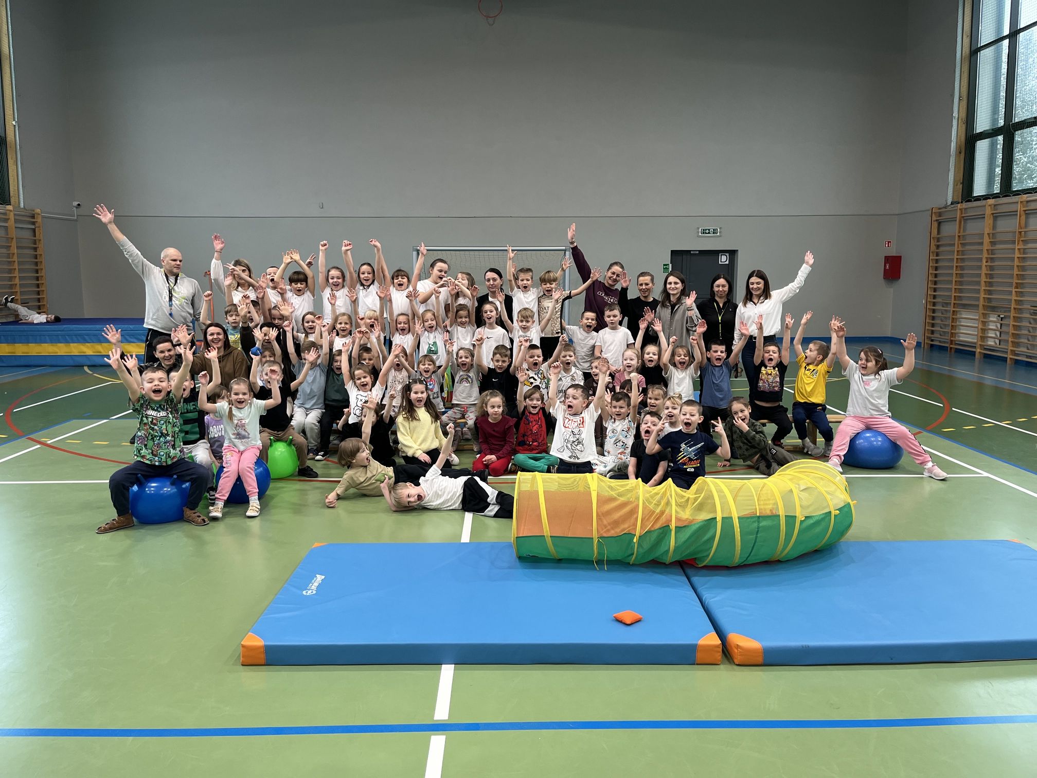 Zajęcia prowadzili nauczyciele wychowania fizycznego – pani Ewelina oraz pan Wojtek, którzy przygotowali wiele wspaniałych i atrakcyjnych zabaw oraz konkurencji ruchowych. W programie znalazły się m.in. slalom, skoki w workach, toczenie piłki oraz inne ćwiczenia rozwijające sprawność, koordynację ruchową i umiejętność współpracy w grupie. Wszystkie konkurencje przebiegały w radosnej atmosferze, pełnej uśmiechu, zdrowej rywalizacji i wzajemnego dopingu. Po zakończeniu zawodów na uczestników czekał mały poczęstunek, a każdy mały sportowiec otrzymał upominek, który był miłym zwieńczeniem tego aktywnego i pełnego wrażeń dnia.